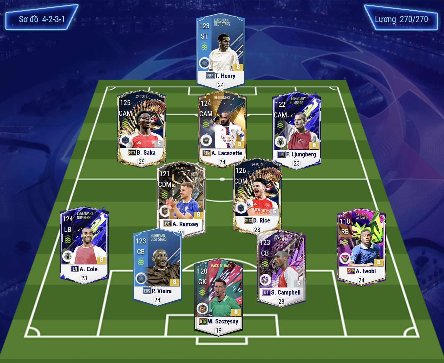 Sơ đồ 4-2-3-1 sử dụng Thierry Henry ở vị trí tiền đạo cắm – một cái tên luôn được xem là biểu tượng của Pháo thủ. Bộ ba tiền vệ công gồm Saka (LAM), Lacazette (CAM) và Ljungberg (RAM), đều là những cầu thủ sở hữu tốc độ tốt cùng khả năng hỗ trợ tấn công và ghi bàn hiệu quả.