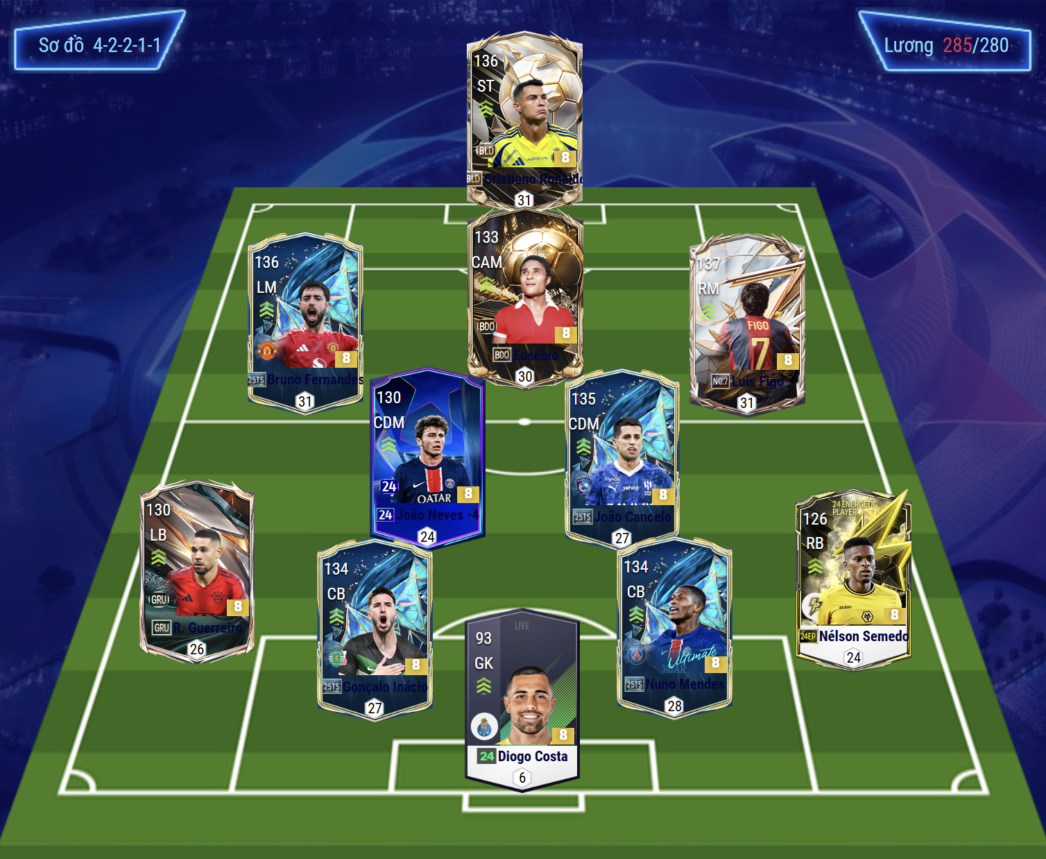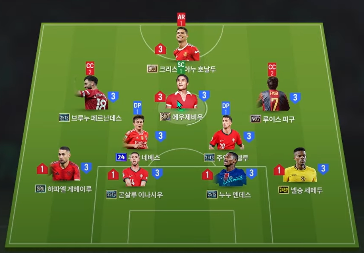 Sơ đồ 4-2-2-1-1 được lựa chọn cho team color Bồ Đào Nha, với Cristiano Ronaldo là trung tâm của hàng công – một tiền đạo toàn diện, vẫn giữ tầm ảnh hưởng đặc biệt trong mọi hệ thống chiến thuật. Hỗ trợ ngay phía sau là huyền thoại Eusébio, người có khả năng dứt điểm tuyến hai và điều phối bóng sắc sảo, đóng vai trò như chiếc cầu nối giữa trung tuyến và tiền đạo cắm.