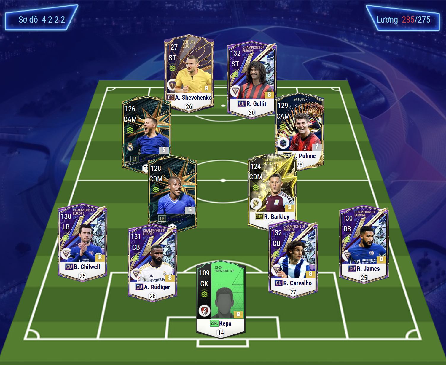 Trên hàng công, Shevchenko và Gullit là cặp tiền đạo chủ lực, toàn diện cả tốc độ, dứt điểm và khả năng không chiến. Hai cánh Hazard và Pulisic mang đến sự cơ động, với tốc độ, khả năng xâm nhập thông minh cùng những pha tạt và dứt điểm hiệu quả.