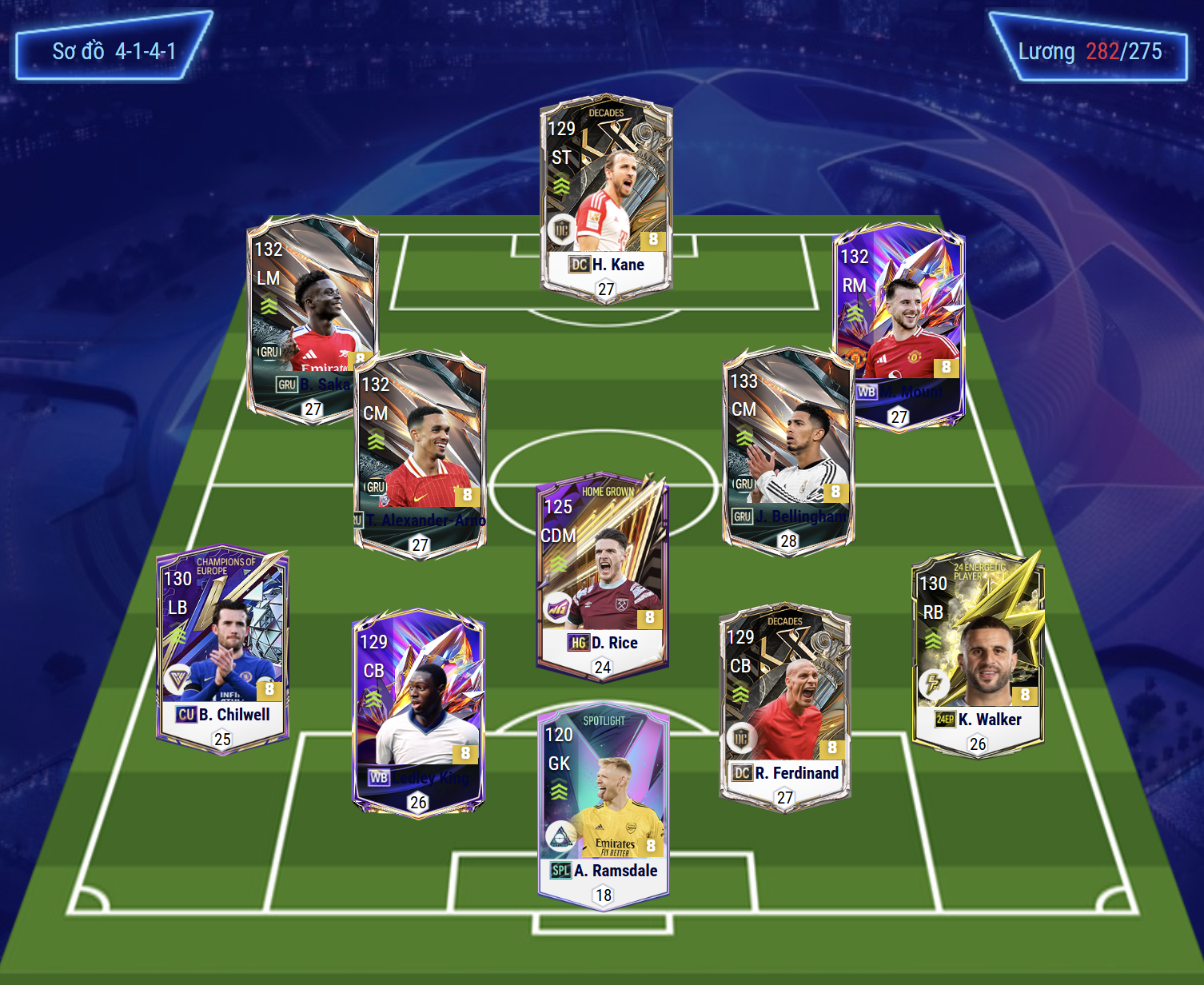 - Hàng thủ: Chilwell và Walker dọc biên, chắc chắn trong phòng ngự và hiệu quả khi tham gia tấn công. Bộ đôi trung vệ Ferdinand – King mang đến sự kết hợp giữa tốc độ, thể hình và AI phòng ngự thông minh. Ramsdale được tin dùng trong khung gỗ.