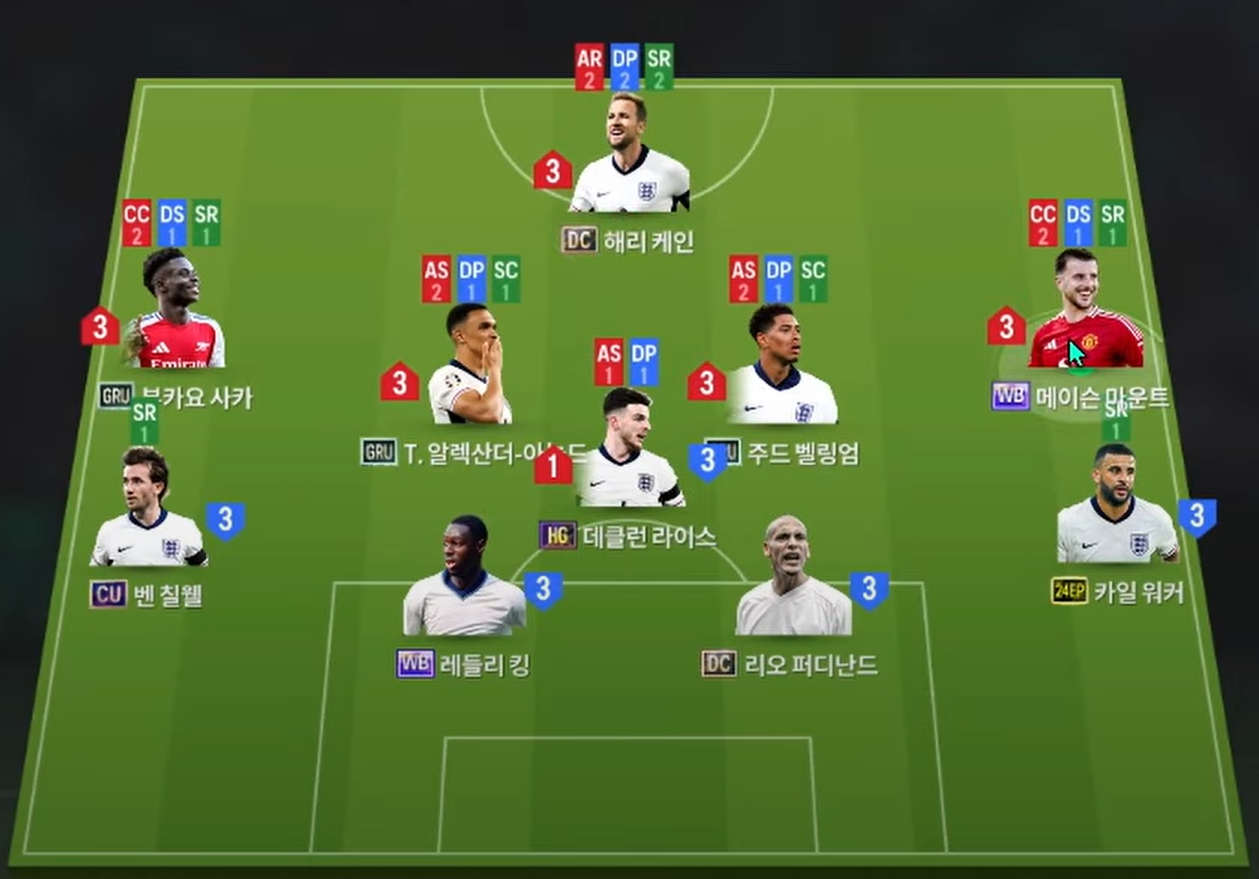 - Hàng tiền vệ: Bukayo Saka và Mason Mount đá lệch cánh, vừa tốc độ vừa đa năng, hỗ trợ tốt cả chuyền tạt lẫn dứt điểm. Ở trung lộ, Arnold và Bellingham mang tới khả năng phối hợp, sút xa và tính cơ động. Declan Rice giữ vai trò mỏ neo, vừa đánh chặn vừa triển khai bóng từ tuyến dưới.