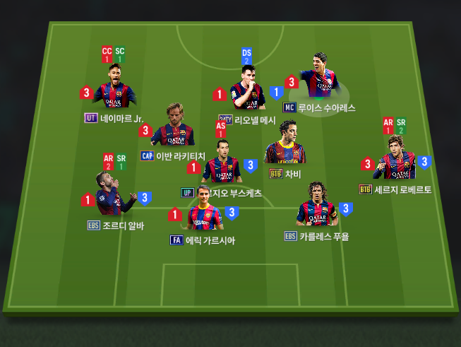 Sơ đồ được áp dụng là 41212 với tiền đạo cánh LW là Neymar. Hộ công Suarez chơi ở vị trí RF trong khi tiền vệ công của sơ đồ là Messi. Tam tấu một thời của Barca trở lại với meta hiện tại. Vị trí tiền vệ trung tâm được lựa chọn là Rakitic và Xavi.