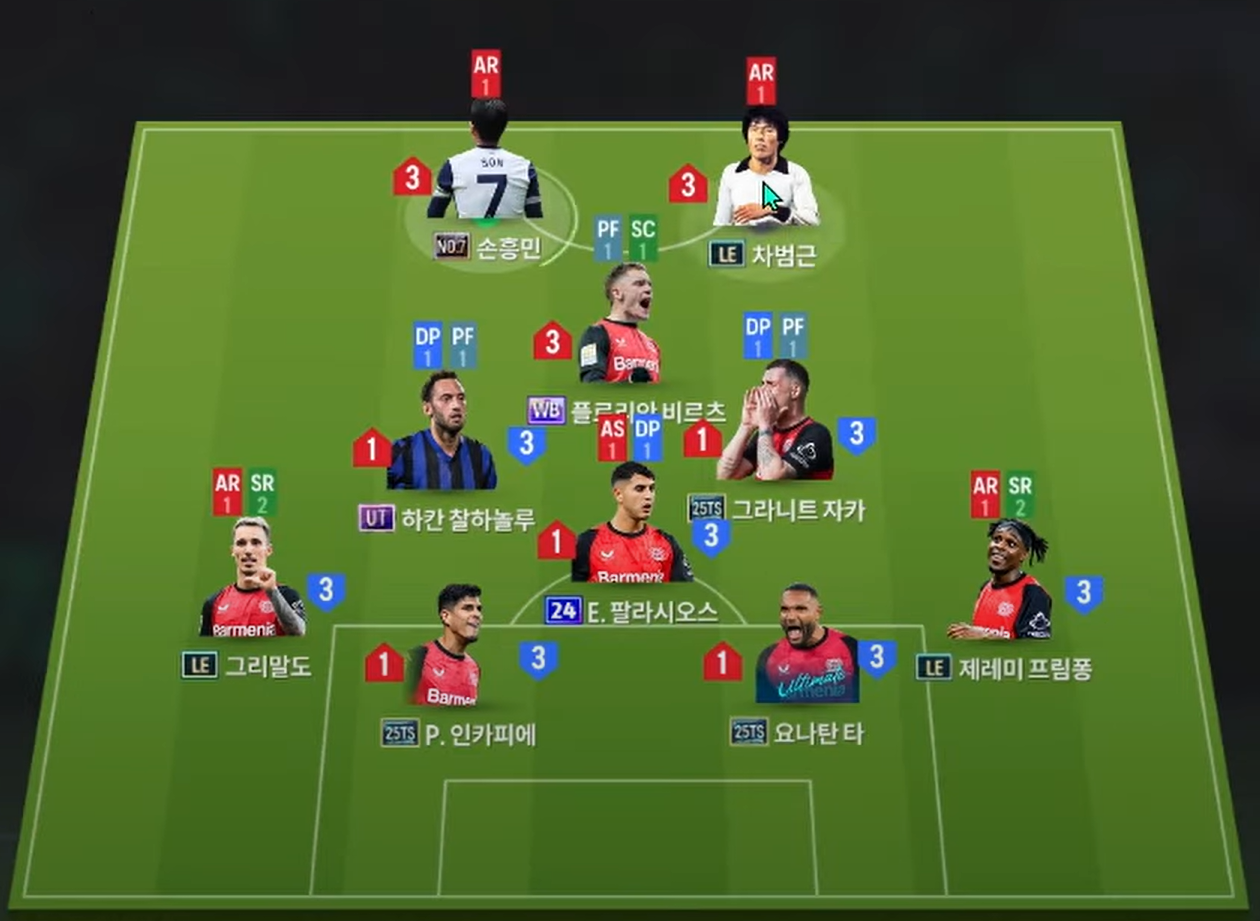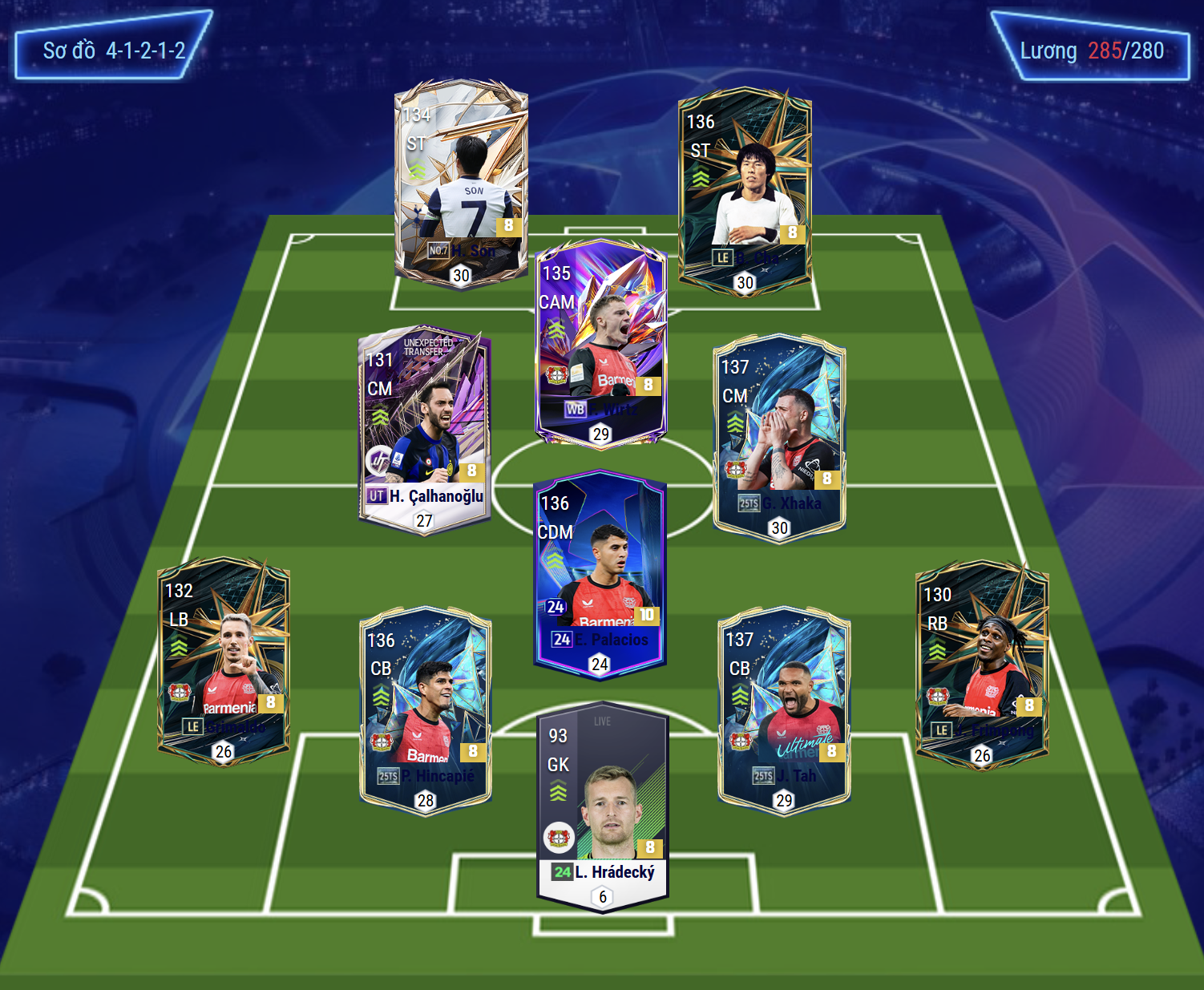 Đội hình 4-1-2-1-2 hẹp là lựa chọn tối ưu cho team color Leverkusen, phát huy tối đa sự gắn kết và tốc độ trong các pha phối hợp trung lộ. Trên hàng công, Son Heung-min và Cha Bum-kun là bộ đôi tiền đạo hoàn hảo — kết hợp giữa sự linh hoạt, tốc độ bùng nổ và khả năng dứt điểm toàn diện bằng cả hai chân. Họ mang đến mối đe dọa thường trực cho mọi hàng thủ, đặc biệt trong các pha phản công nhanh.