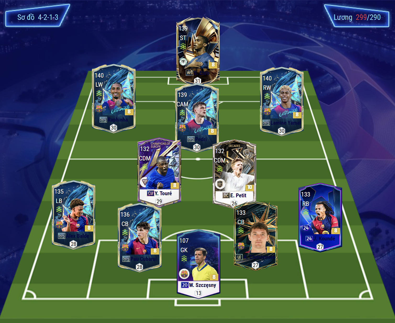 Hàng phòng ngự gồm Balde và Kounde ở hai biên, sở hữu tốc độ tốt, khả năng đeo bám và hỗ trợ tấn công hiệu quả khi cần. Trung tâm là Cubarsi và Christensen – bộ đôi có khả năng xoay sở linh hoạt, cắt bóng và tranh chấp ổn định, phù hợp với meta thiên về tốc độ hiện tại. Trong khung thành, Szczesny là lựa chọn đáng tin cậy nhờ phản xạ và kinh nghiệm thi đấu.