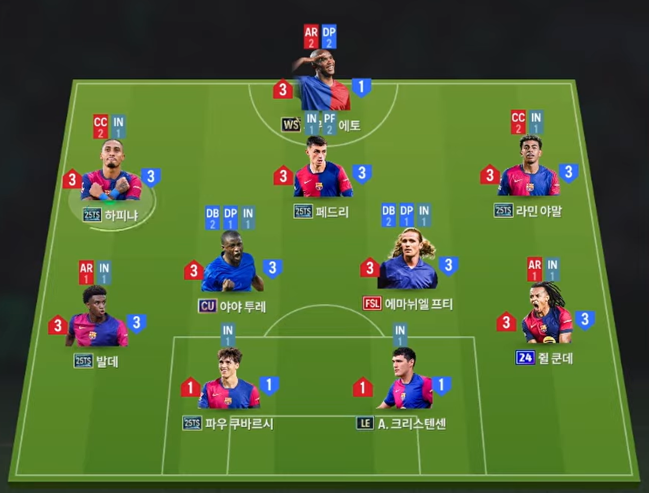 Sơ đồ 4-2-1-3 được sử dụng với Eto’o đảm nhiệm vai trò trung phong. Anh là mẫu tiền đạo giàu tốc độ, rê dắt tốt và sở hữu khả năng dứt điểm đa dạng, phù hợp với những tình huống băng cắt hoặc khai thác khoảng trống sau hàng thủ. Hai cánh là Raphinha và Yamal – bộ đôi giàu tốc độ và kỹ thuật. Cả hai có thể đột phá, tạt bóng hoặc bó vào trong để dứt điểm, tạo nên sự linh hoạt cho mặt trận tấn công biên.