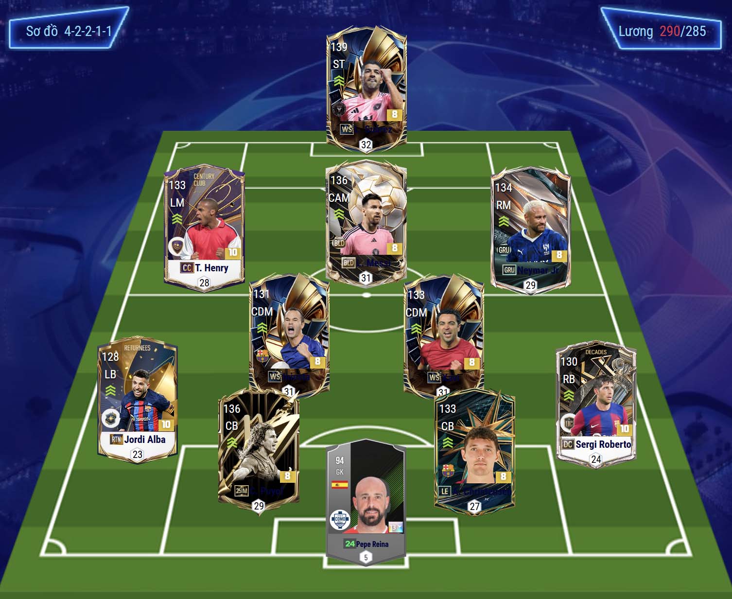 Hàng thủ gồm Jordi Alba và Sergi Roberto ở hai cánh, vừa đảm bảo khả năng hỗ trợ tấn công, vừa duy trì mức độ phòng ngự đủ ổn định. Trung tâm hàng phòng ngự là Puyol và Christensen, những trung vệ sở hữu AI phòng ngự tốt, khả năng đọc tình huống và thích nghi meta hiệu quả. Trong khung gỗ, Reina là lựa chọn đáng tin cậy nhờ sự ổn định và kinh nghiệm.