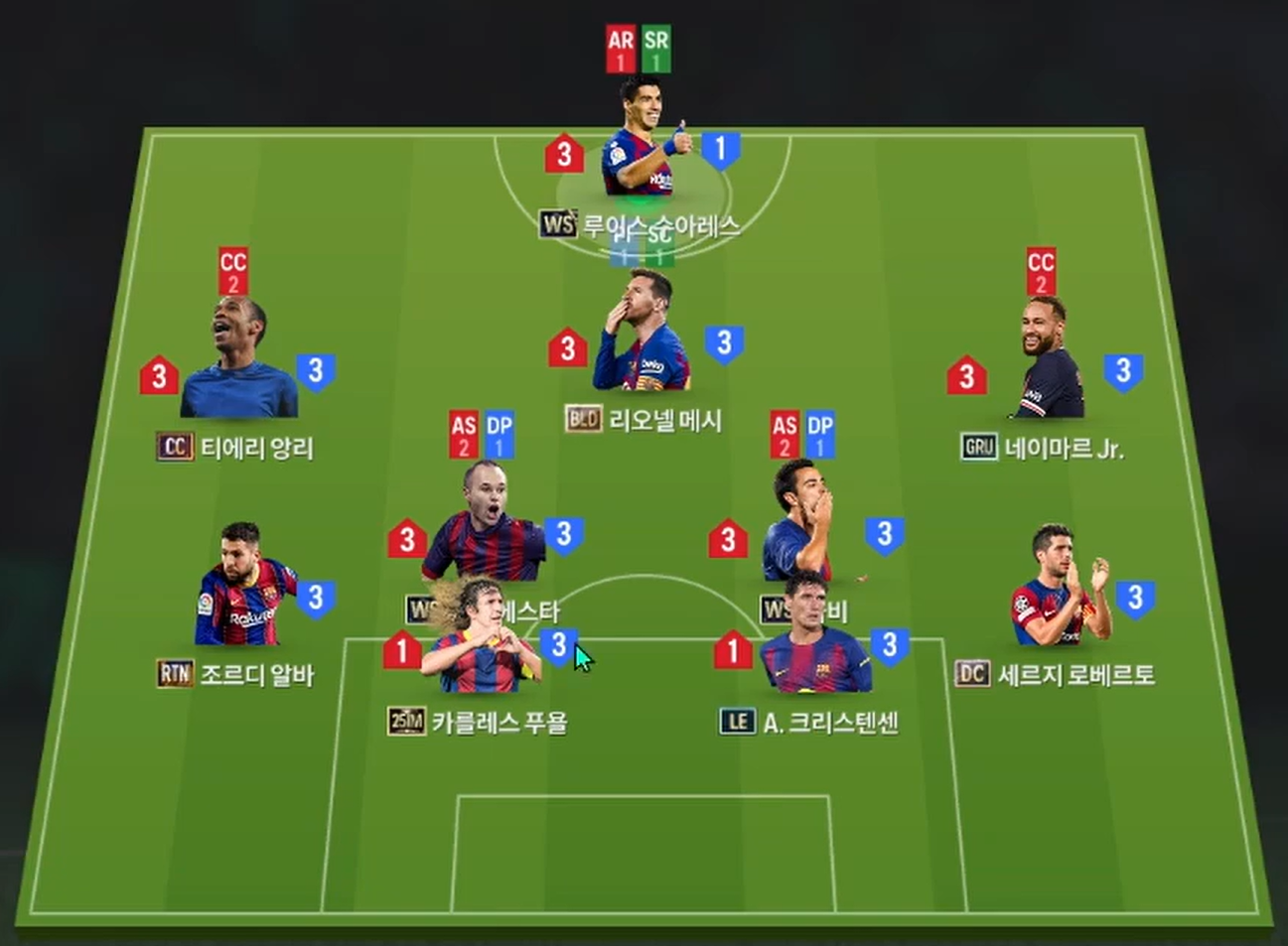 Hai hành lang cánh được giao cho Neymar và Henry, những cầu thủ sở hữu tốc độ tốt, kỹ năng rê dắt nổi bật cùng AI xâm nhập biên hiệu quả. Bộ đôi này giúp kéo giãn hàng thủ đối phương, tạo thêm phương án tiếp cận khung thành thay vì chỉ tập trung vào trung lộ. Ở tuyến giữa, Iniesta và Xavi tạo thành cặp tiền vệ phòng ngự thiên về kiểm soát. Khả năng giữ bóng, thoát pressing và chuyền bóng chính xác của bộ đôi này giúp Barcelona triển khai thế trận một cách mượt mà, đúng với tinh thần tiki-taka quen thuộc.
