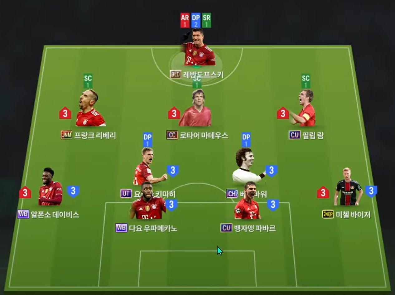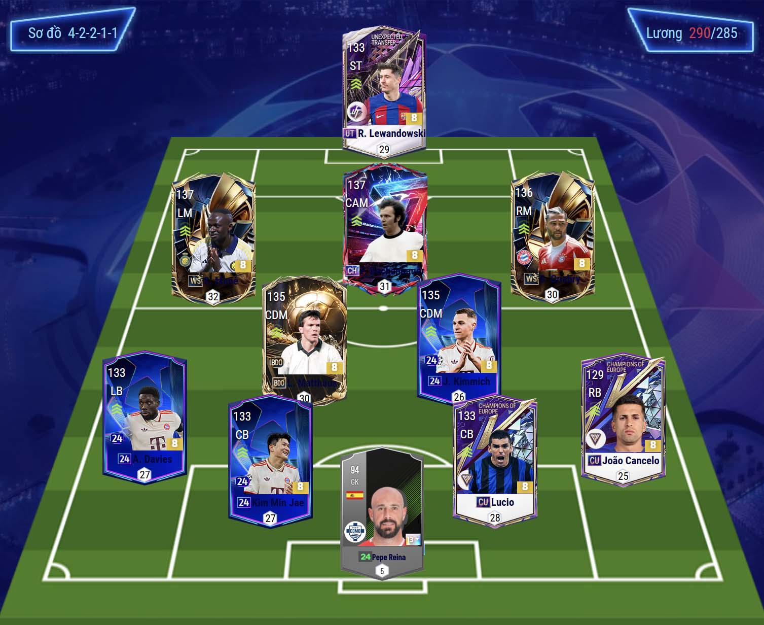 Ở tuyến giữa, Lothar Matthäus và Joshua Kimmich tạo thành cặp tiền vệ phòng ngự toàn diện. Matthäus mang đến sức mạnh, khả năng tranh chấp và sút xa ấn tượng, trong khi Kimmich đóng vai trò giữ nhịp, phân phối bóng và hỗ trợ phòng ngự thông minh. Sự kết hợp này giúp Bayern vừa đảm bảo khả năng thu hồi bóng, vừa duy trì được quyền kiểm soát thế trận. Hàng thủ gồm Alphonso Davies và João Cancelo ở hai cánh, những hậu vệ biên có tốc độ cao, khả năng hỗ trợ tấn công nổi bật nhưng vẫn đảm bảo hiệu quả phòng ngự. Cặp trung vệ Kim Min-jae và Lucio sở hữu thể hình tốt, tốc độ ổn định, khả năng tranh chấp và không chiến đáng tin cậy, phù hợp với meta hiện tại. Trong khung gỗ, Reina là lựa chọn an toàn nhờ sự ổn định và kinh nghiệm thi đấu.