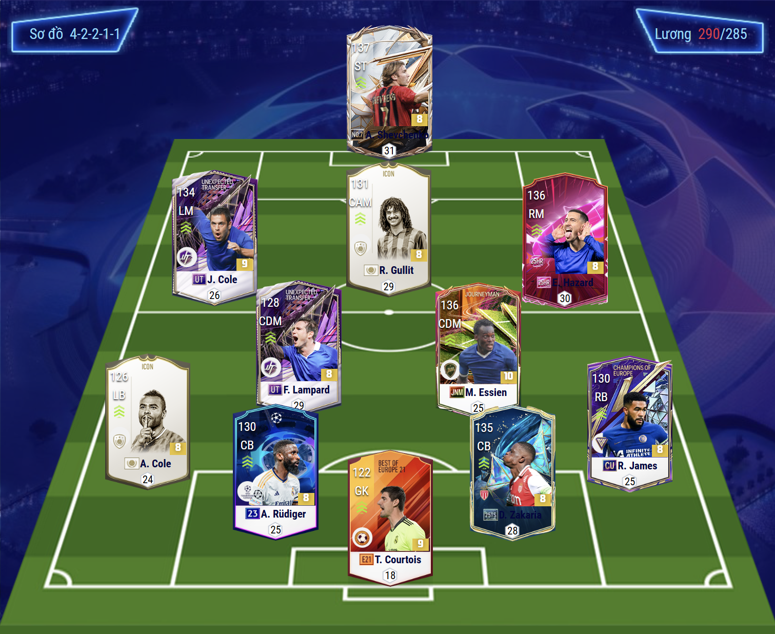 Ở trung tuyến, Lampard và Essien tạo thành cặp đôi “hai họng pháo” đúng nghĩa: sút xa chính xác, chuyền bóng chuẩn xác và hỗ trợ phòng ngự bền bỉ. Hàng thủ gồm Ashley Cole và Reece James ở hai cánh – những người có tốc độ, thể lực cùng kỹ năng hỗ trợ tấn công lẫn phòng ngự đáng tin cậy. Ở trung tâm là Rudiger và Zakaria với AI phòng ngự thông minh, phản ứng nhanh và khả năng cắt bóng ổn định. Trong khung gỗ, Courtois vẫn là lựa chọn hàng đầu nhờ sải tay dài và phản xạ xuất sắc.