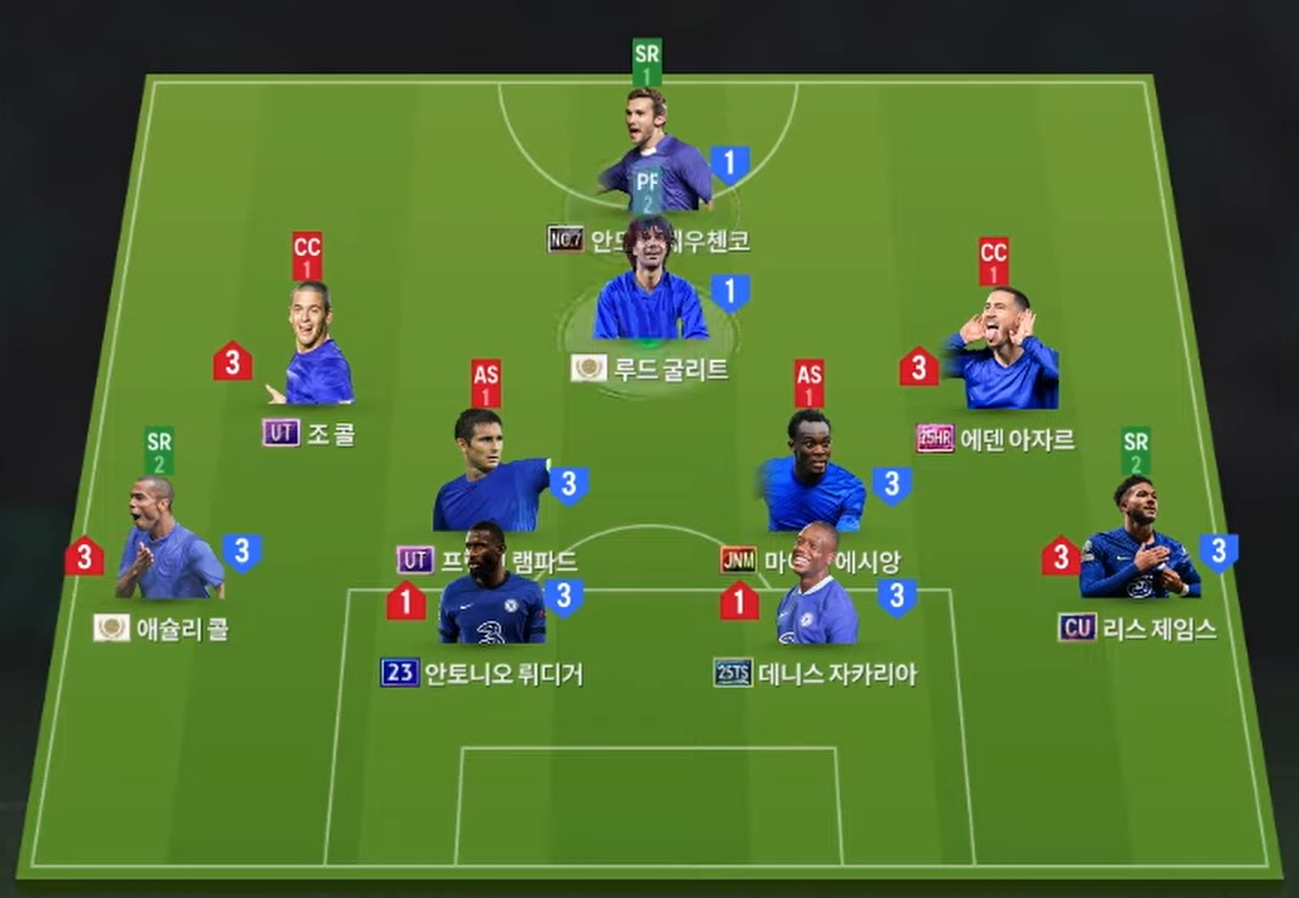 Chelsea vận hành với sơ đồ 4-2-2-1-1, đặt Shevchenko ở vị trí mũi nhọn. Huyền thoại người Ukraine là mẫu tiền đạo toàn diện, dứt điểm tốt bằng cả hai chân và nguy hiểm ở mọi khoảng cách. Đá ngay phía sau là Gullit – tiền vệ quốc dân với khả năng bắn phá tuyến hai và tạo đột biến cực mạnh. Hai bên hành lang là Joe Cole và Eden Hazard – bộ đôi sở hữu tốc độ, khả năng bứt tốc, chuyền – tạt bằng cả hai chân và xâm nhập vòng cấm rất hiệu quả.