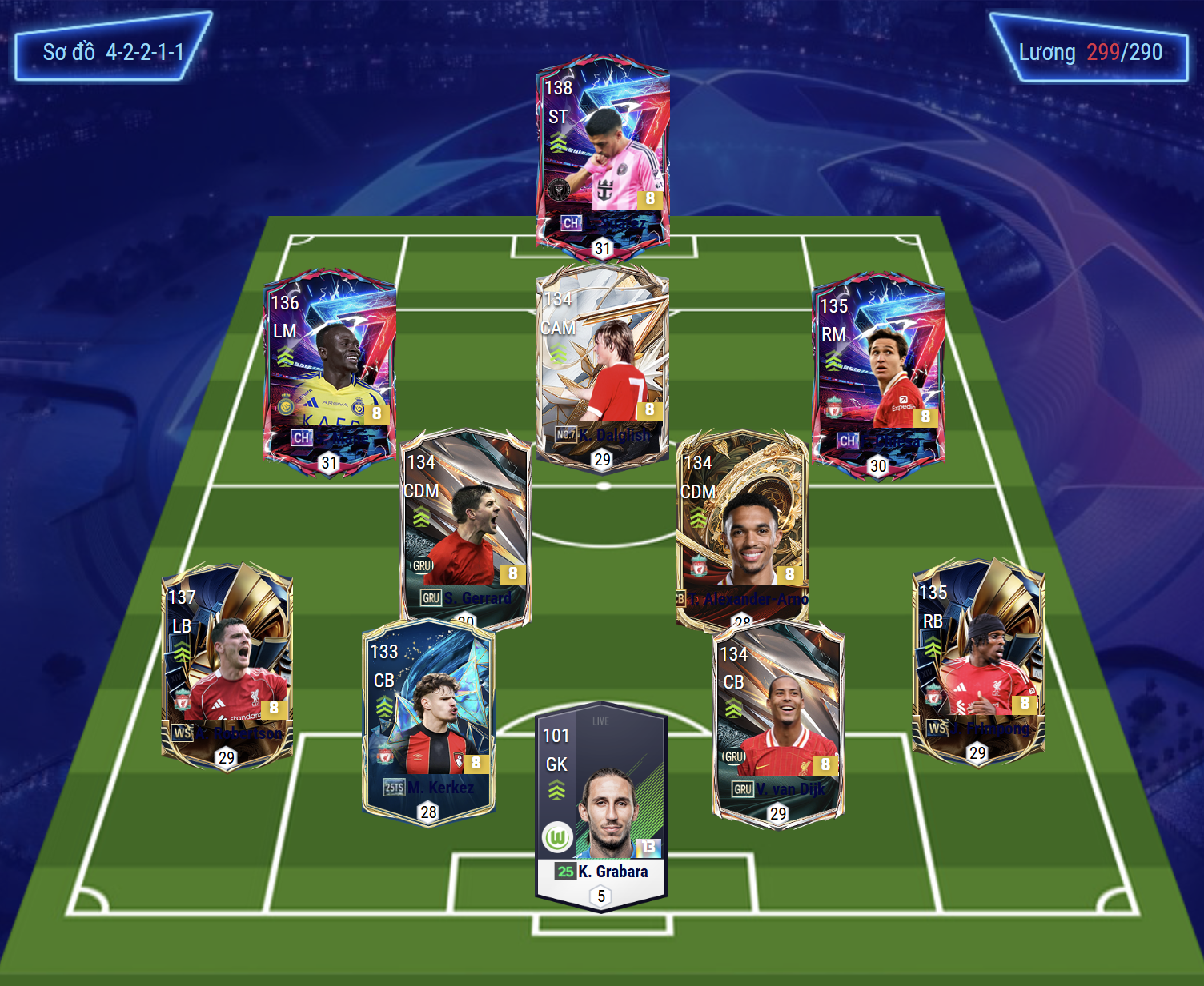 Sơ đồ 4-2-2-1-1 được lựa chọn cho team color Liverpool với Luis Suárez đảm nhiệm vai trò tiền đạo cắm. Tiền đạo người Uruguay nổi bật với khả năng di chuyển thông minh, dứt điểm sắc bén bằng cả hai chân và sự nguy hiểm trong mọi tình huống xử lý trong vòng cấm lẫn ngoài vòng cấm. Chơi phía sau Suárez là Kenny Dalglish trong vai trò hộ công (CAM). Huyền thoại người Scotland sở hữu khả năng chuyền bóng tinh tế, dứt điểm hiệu quả cùng kỹ năng rê dắt và di chuyển thông minh, giúp kết nối lối chơi và tạo ra nhiều cơ hội cho tuyến trên.