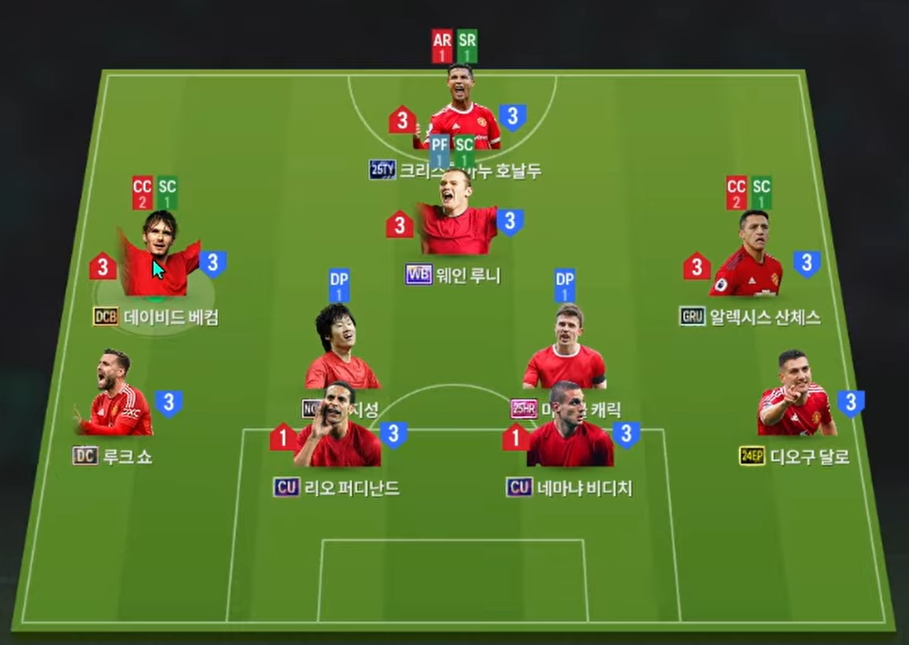 Hai cánh là Beckham và Sanchez – những cầu thủ sở hữu tốc độ tốt, kỹ năng tạt bóng chuẩn xác và khả năng dứt điểm từ xa uy lực, luôn là lựa chọn tối ưu cho lối chơi bám biên của team color Man Utd. Cặp tiền vệ phòng ngự Park Ji Sung – Carrick mang lại sự cân bằng ở tuyến giữa: chuyền bóng ổn định, giữ nhịp, kiểm soát thế trận và hỗ trợ phòng ngự cực kỳ hiệu quả.