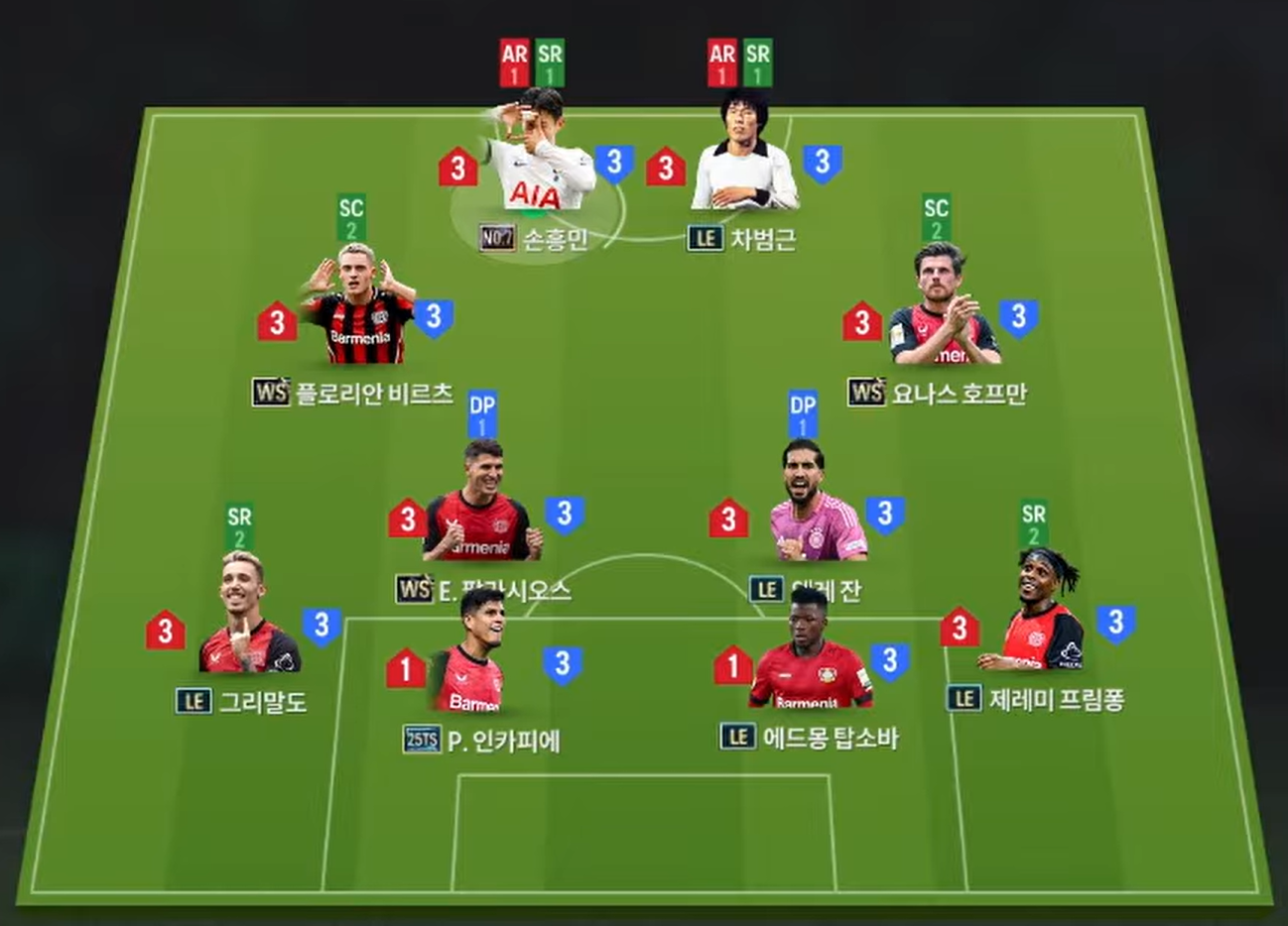 Sơ đồ 4-2-2-2 được lựa chọn nhằm tối ưu sức mạnh trên hàng công với cặp tiền đạo Son Heung-min và Cha Bum-kun. Cả hai đều sở hữu tốc độ vượt trội, khả năng dứt điểm hiệu quả bằng hai chân cùng AI di chuyển thông minh, giúp Leverkusen luôn nguy hiểm trong các pha phản công và tấn công trực diện. Phía sau, Florian Wirtz và Jonas Hofmann đảm nhiệm vai trò tiền vệ công lệch cánh. Đây là những cầu thủ có khả năng xử lý bóng linh hoạt, nhãn quan kiến tạo tốt và sẵn sàng tung ra những cú sút xa khi có khoảng trống. Sự cơ động của cặp đôi này giúp tuyến giữa và hàng công kết nối mạch lạc hơn trong quá trình triển khai bóng.