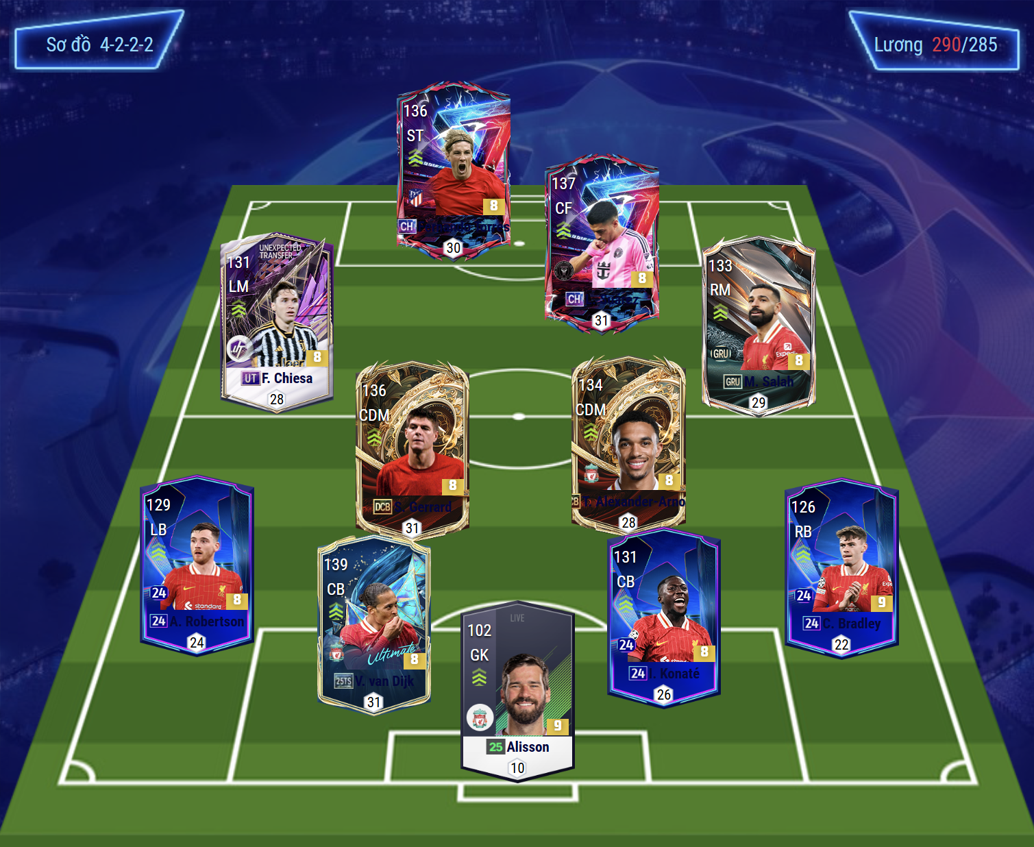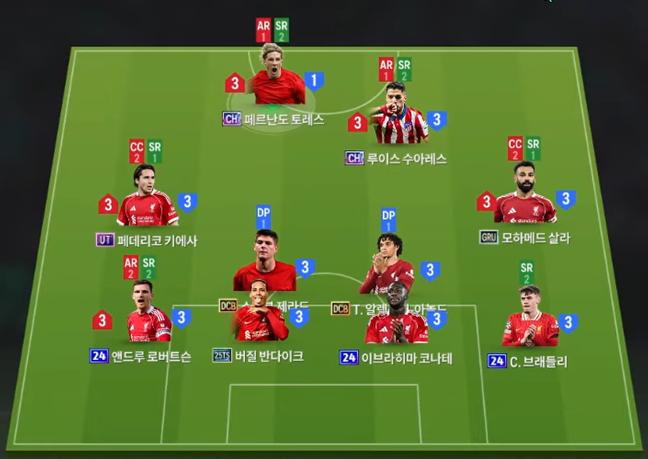 Sơ đồ 4-2-2-2 được lựa chọn nhằm tối ưu sức sát thương của cặp tiền đạo Torres – Suárez. Cả hai đều sở hữu AI di chuyển thông minh, khả năng dứt điểm ổn định bằng hai chân và bộ kỹ năng xử lý bóng đủ linh hoạt để phối hợp trong không gian hẹp. Khả năng không chiến ở mức tròn vai giúp bộ đôi này đa dạng hơn trong các tình huống tiếp cận khung thành.