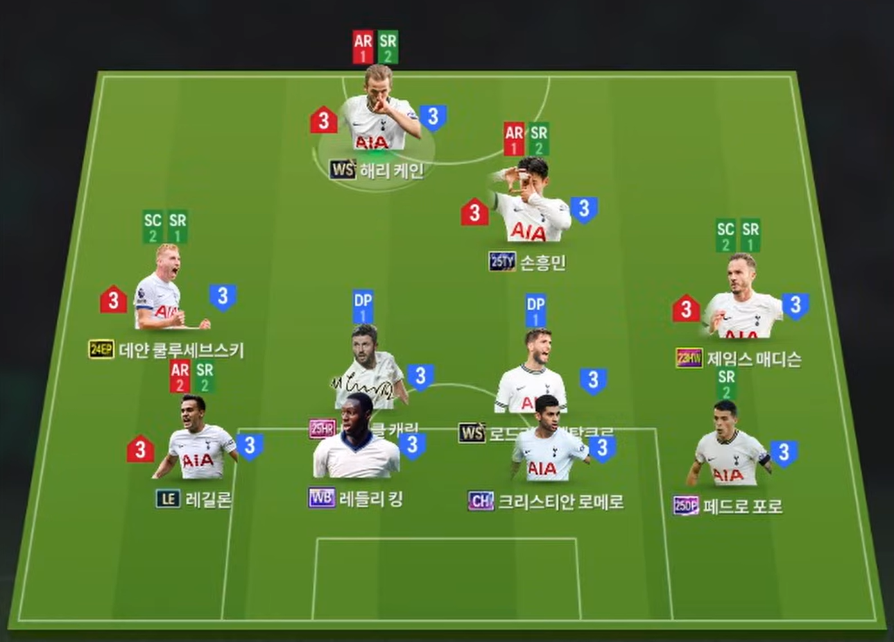 Hàng phòng ngự gồm Reguilón và Pedro Porro ở hai biên, mang lại tốc độ, khả năng tranh chấp và hỗ trợ tấn công tương đối tốt. Ở trung tâm hàng thủ, Ledley King và Romero tạo thành cặp trung vệ giàu thể hình, tốc độ và AI phòng ngự ổn định, đủ sức đối phó với các tình huống áp lực cao. Trong khung gỗ, Vicario là lựa chọn mang lại sự an tâm nhờ phản xạ tốt và phong độ ổn định.
