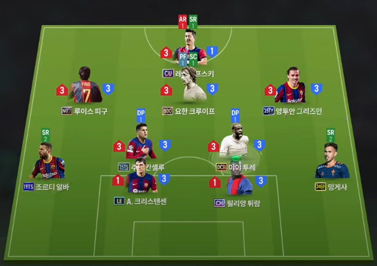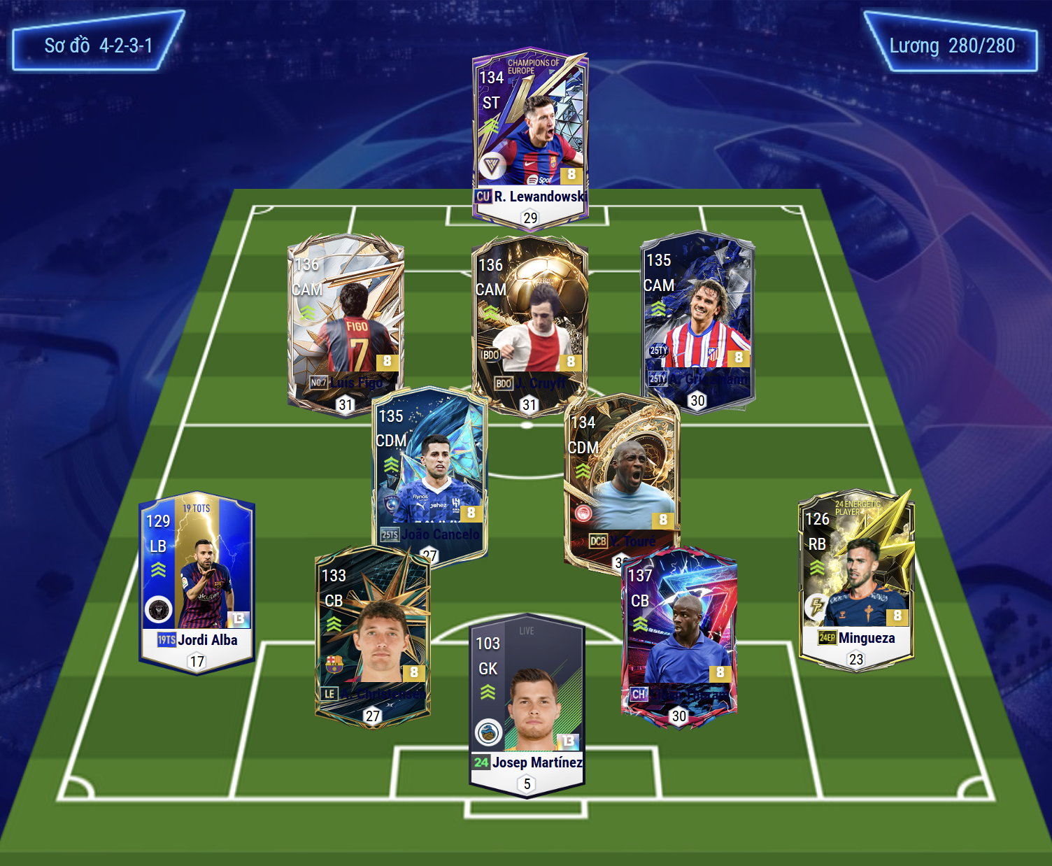 Sơ đồ 4-2-3-1 được lựa chọn để phát huy tối đa sức mạnh của đội hình. Ở vị trí tiền đạo cắm, Lewandowski là lựa chọn hoàn hảo nhờ khả năng dứt điểm toàn diện — từ sút xa, đánh đầu đến xử lý trong vòng cấm. Hỗ trợ phía sau là bộ ba Figo, Cruyff và Griezmann, những cầu thủ có thể hoán đổi linh hoạt: