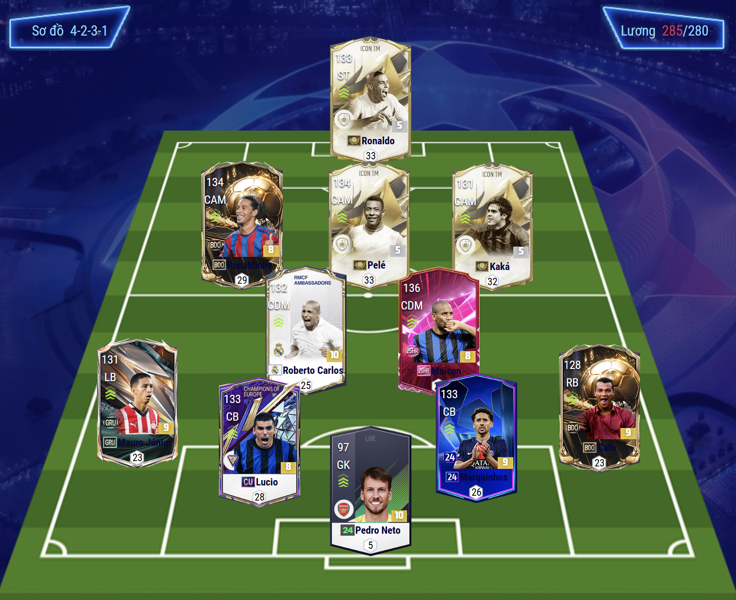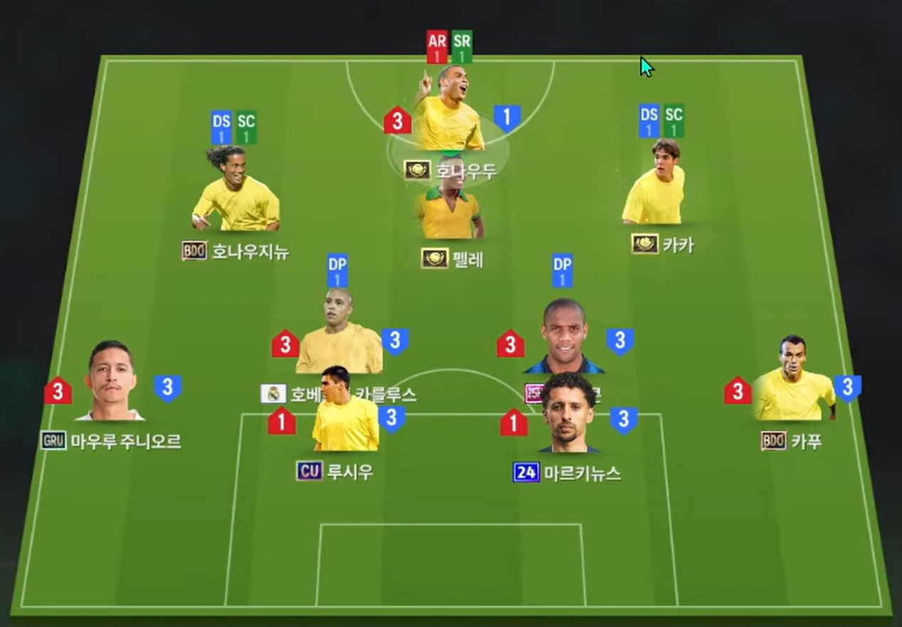Đội hình được lựa chọn cho team color Brazil là sơ đồ 4-2-3-1, giúp tối ưu cả khả năng tấn công lẫn sự chắc chắn nơi tuyến giữa. Ở vị trí tiền đạo cắm, Ronaldo De Lima là mũi nhọn chủ lực – một “sát thủ” toàn diện với tốc độ, khả năng dứt điểm tinh tế cùng AI di chuyển cực kỳ thông minh, luôn biết cách chọn vị trí để kết liễu đối phương. Phía sau anh là bộ ba tấn công lừng danh gồm Ronaldinho (LAM), Pelé (CAM) và Kaká (RAM). Ronaldinho và Kaká có xu hướng bám biên, tận dụng kỹ năng rê bóng, tốc độ và khả năng tạo đột biến, trong khi Pelé chơi ở trung tâm như một “linh hồn sáng tạo” – vừa kiến thiết, vừa dứt điểm khi cơ hội mở ra.