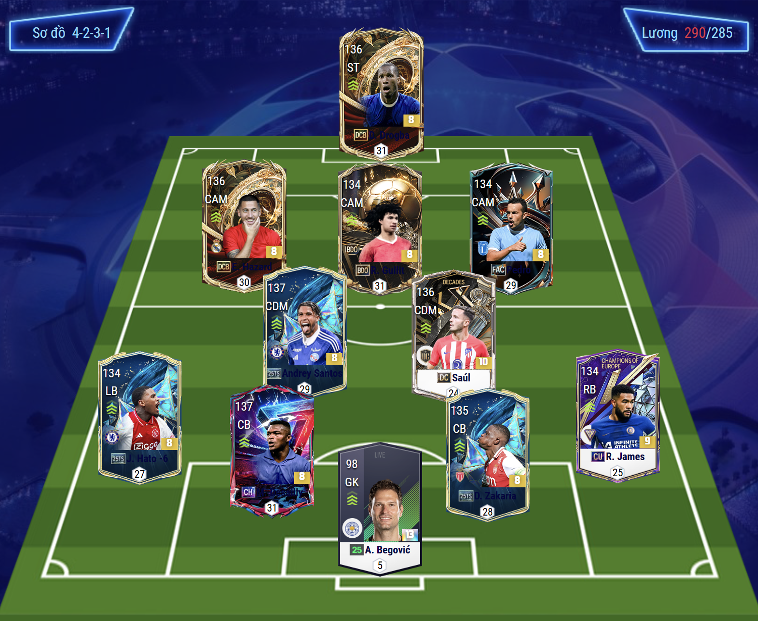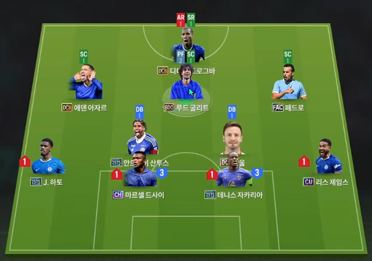 Phía sau Drogba là bộ ba hỗ trợ gồm Hazard, Gullit và Pedro lần lượt đảm nhiệm các vai trò LAM, CAM và RAM. Hazard và Pedro thiên về bám biên, khai thác tốc độ và khả năng xử lý trong không gian hẹp, trong khi Gullit đóng vai trò hộ công trung tâm với khả năng xâm nhập tuyến hai, chuyền bóng và dứt điểm từ xa đầy hiệu quả. Ở tuyến giữa, Andre Santos và Saúl được tin dùng trong vai trò tiền vệ phòng ngự nhờ lối chơi toàn diện. Cả hai đều có khả năng phân phối bóng ổn định, hỗ trợ phòng ngự tốt và sẵn sàng dâng cao khi đội cần gia tăng sức ép tấn công.