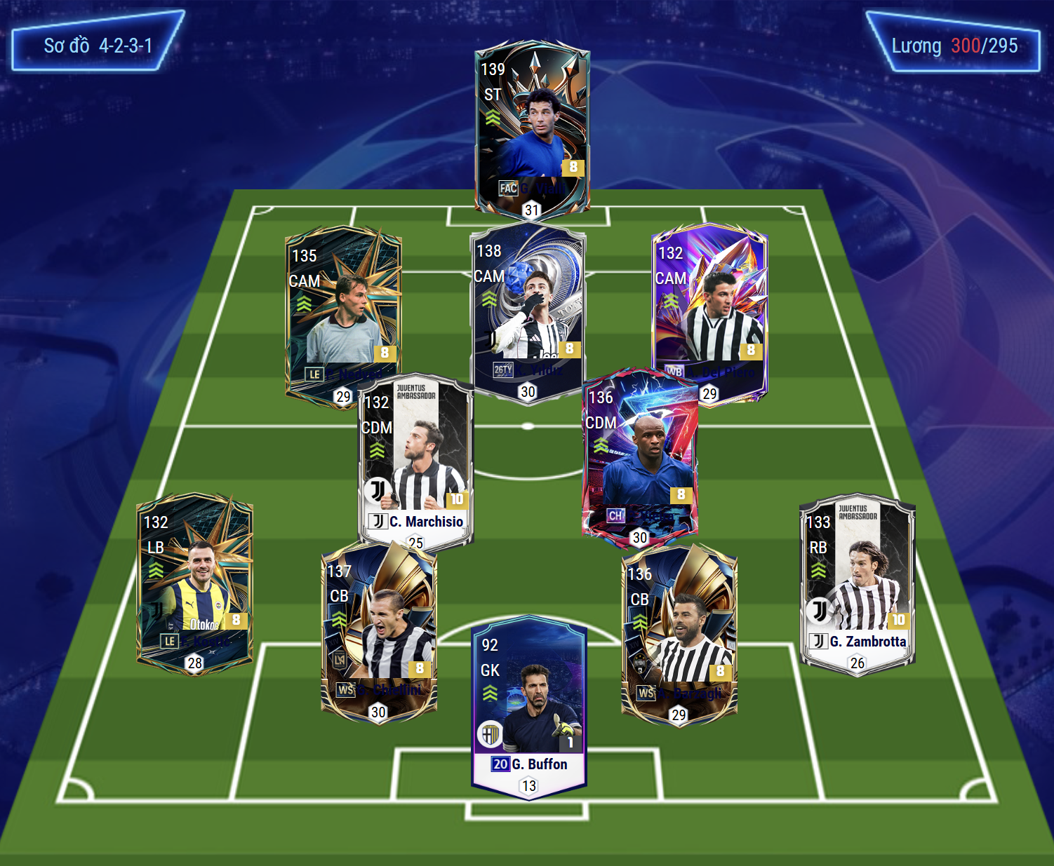 Bộ ba tiền vệ công phía sau gồm Pavel Nedvěd, Kenan Yıldız và Alessandro Del Piero. Trong đó, Nedvěd và Del Piero có xu hướng hoạt động rộng ở hai biên, tận dụng khả năng rê dắt và dứt điểm, trong khi Yıldız chơi bó vào trung lộ nhiều hơn, đảm nhận vai trò hộ công và kết nối lối chơi. Ở tuyến giữa, Claudio Marchisio và Patrick Vieira mang lại sự cân bằng với khả năng tranh chấp, chuyền bóng và hỗ trợ phòng ngự hiệu quả.