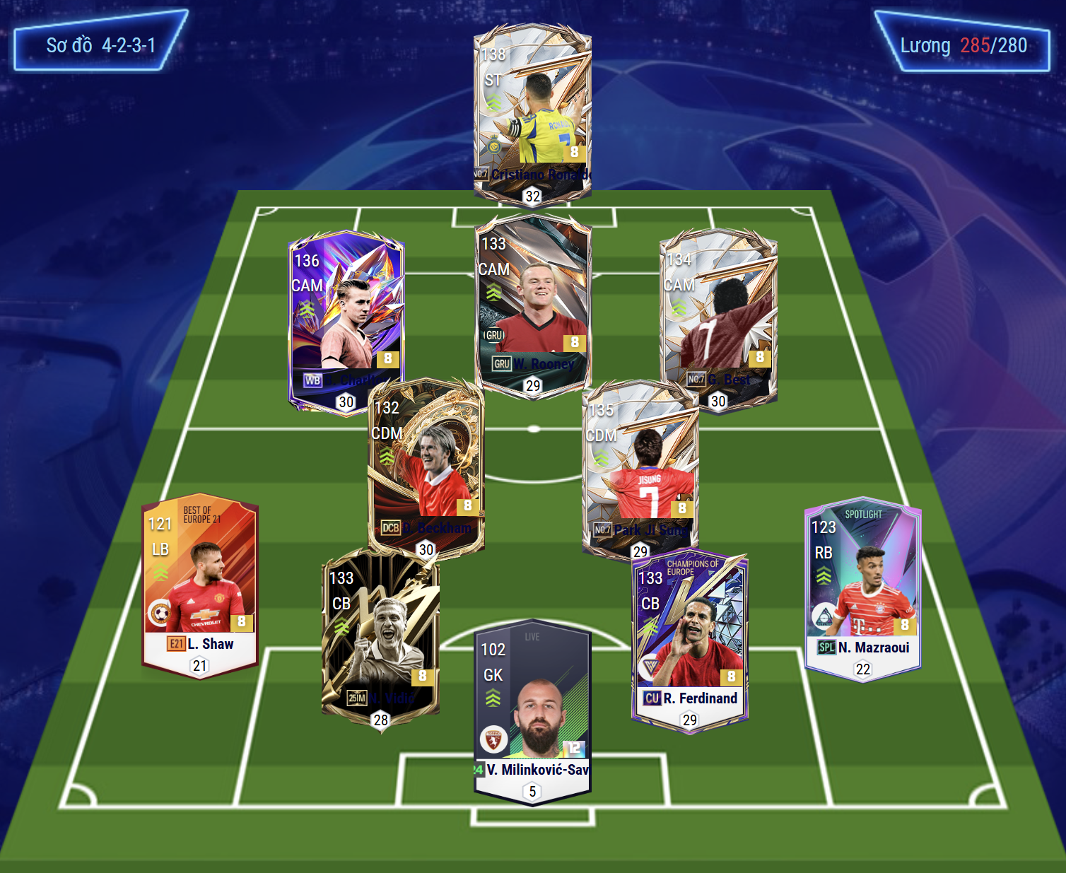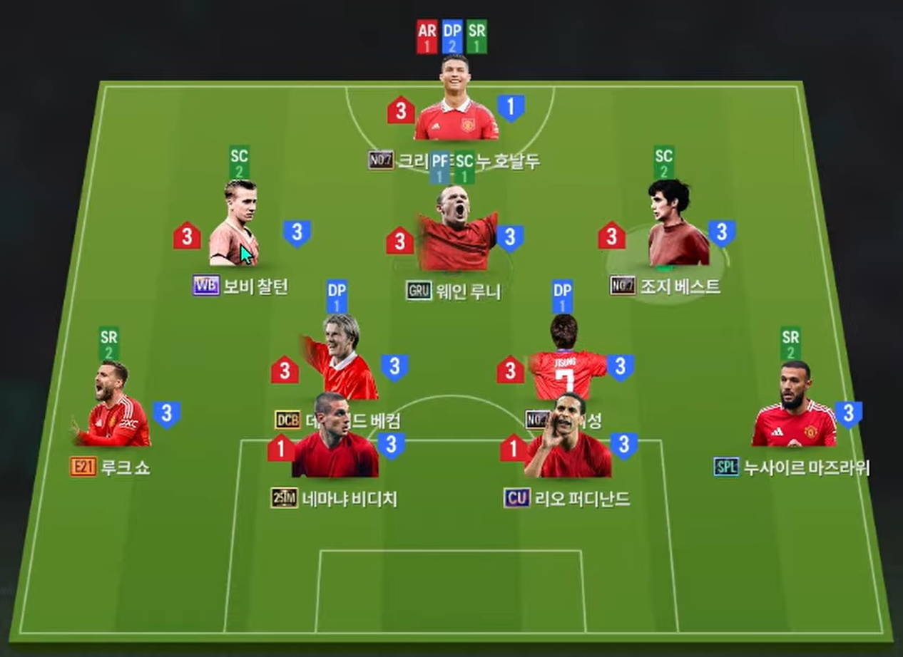 Tuyến giữa với bộ đôi Beckham và Park Ji Sung đem lại sự cân bằng giữa công và thủ. Cả hai đều sở hữu kỹ năng chuyền bóng chính xác, khả năng sút xa uy lực và tinh thần thi đấu không biết mệt mỏi – đúng chất “Quỷ đỏ” trong từng pha bóng. Hàng thủ được tổ chức với Shaw và Mazraoui ở hai biên, đảm bảo tốc độ và khả năng hỗ trợ tấn công. Trung tâm phòng ngự là bộ đôi huyền thoại Ferdinand – Vidić, tạo thành bức tường thép trước khung thành của thủ môn Savic.