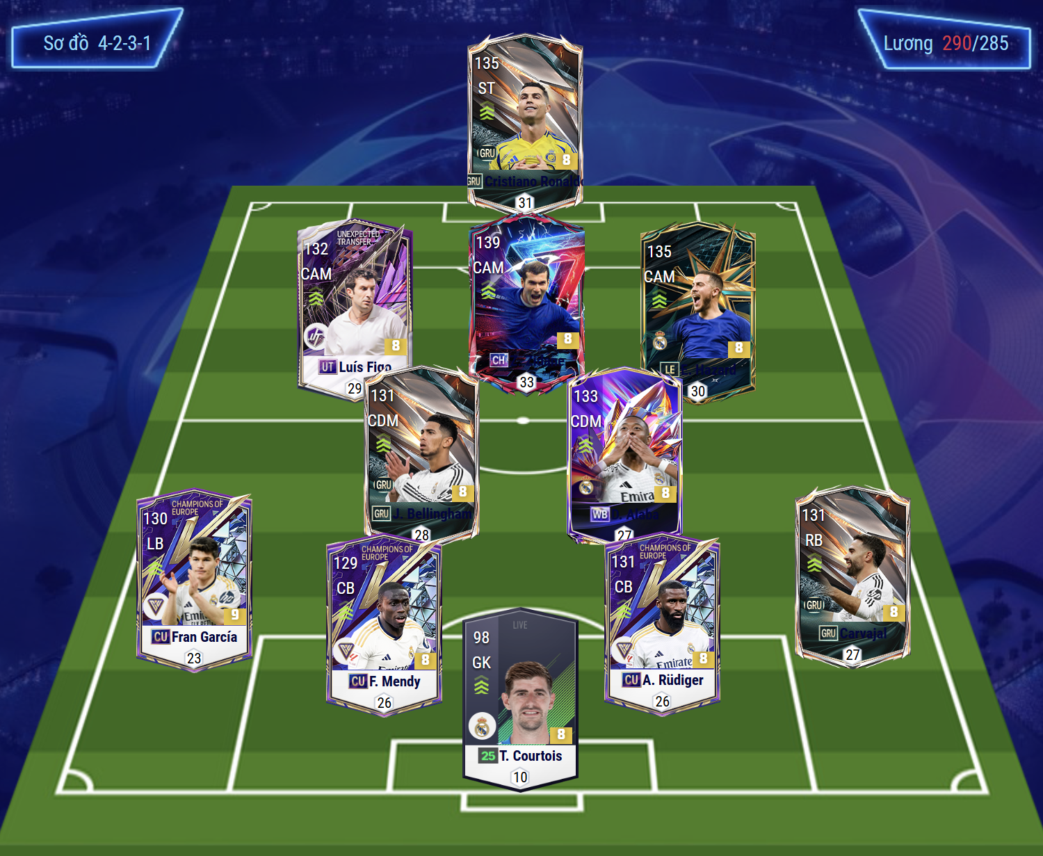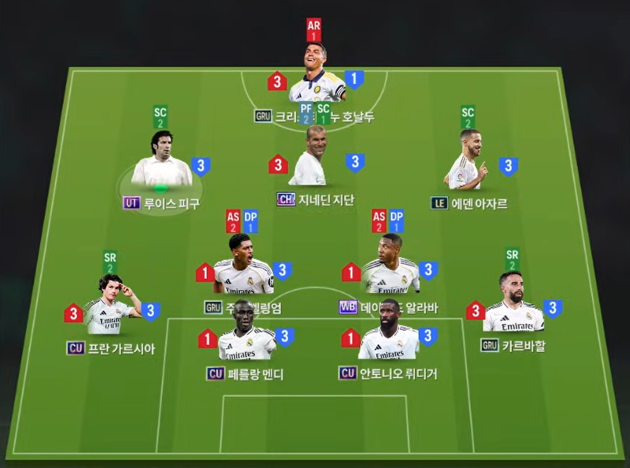 Phía sau là bộ ba tiền vệ công Figo, Zidane và Hazard lần lượt đảm nhiệm các vị trí LAM, CAM và RAM. Trong đó, Figo và Hazard có xu hướng bám biên nhiều hơn, tận dụng tốc độ và kỹ thuật để khuấy đảo hành lang cánh, còn Zidane đóng vai trò nhạc trưởng ở trung lộ với khả năng điều tiết, chuyền bóng và tung ra những cú sút xa tuyến hai đầy uy lực. Tuyến giữa được giao cho Bellingham và Alaba – hai tiền vệ đa năng với vai trò phân chia rõ ràng. Bellingham thiên về hỗ trợ tấn công, xâm nhập vòng cấm và tạo đột biến, trong khi Alaba chơi lùi hơn, giữ nhịp và hỗ trợ phòng ngự hiệu quả.