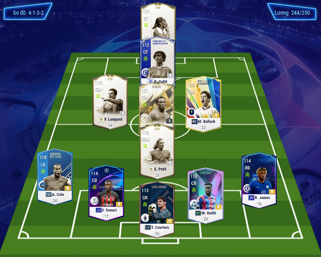 Trong đội hình, Gullit CFA , Ballack MC có thể nâng cấp lên phiên bản ICON hoặc ICON TM nếu bạn muốn khi mà quỹ lương vẫn còn 6 đơn vị nữa, đồng thời có thể giảm lương vị trí của Courtois để gia tăng quỹ lương của mình.