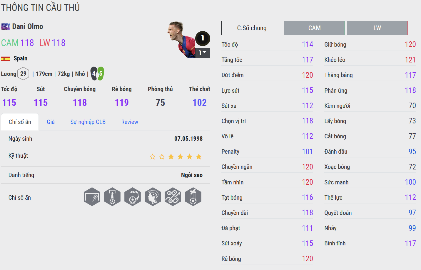 Dani Olmo mùa thẻ CH trong FC Online mang đến hình ảnh một tiền vệ công hiện đại, giàu sáng tạo và có khả năng tạo khác biệt trong những tình huống quan trọng. Với kỹ thuật khéo léo, tầm nhìn nhạy bén cùng khả năng tham gia tấn công đa dạng, Olmo là quân bài chiến lược cho những HLV ưa thích lối đá kiểm soát và giàu tính đột biến.