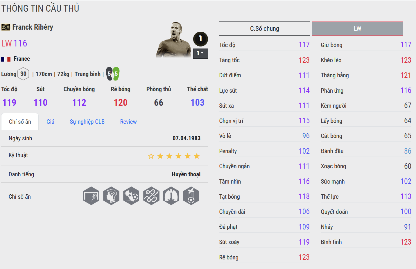 Franck Ribéry mùa 25IM trong FC Online là hình ảnh đậm nét của “Gã mặt sẹo” thời kỳ đỉnh cao – tốc độ, kỹ thuật và đậm chất nghệ sĩ. Ở mùa thẻ này, Ribéry được tái hiện gần như hoàn hảo phong cách của anh trong màu áo Bayern Munich: bùng nổ bên hành lang cánh, xử lý mềm mại và luôn tiềm ẩn khả năng tạo ra khác biệt bằng một pha bóng đầy ngẫu hứng. Anh là lựa chọn hàng đầu cho những ai yêu thích lối đá tấn công giàu cảm xúc và đột biến.