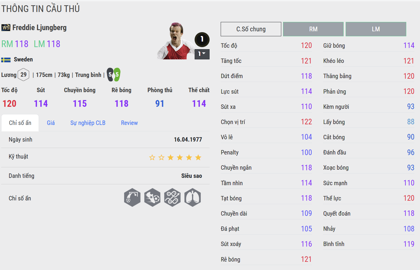 Ljungberg WS không mạnh về thể hình, nhưng bù lại trọng tâm thấp và giữ thăng bằng khá tốt. Anh không đủ sức để tì đè trực diện với hậu vệ to khoẻ, nhưng đủ để không bị bật lại quá dễ dàng, đặc biệt khi đang chạy tốc độ cao. Nếu bạn sử dụng anh đúng phong cách tốc độ – di chuyển – phối hợp nhanh, điểm tì đè sẽ không phải vấn đề lớn.