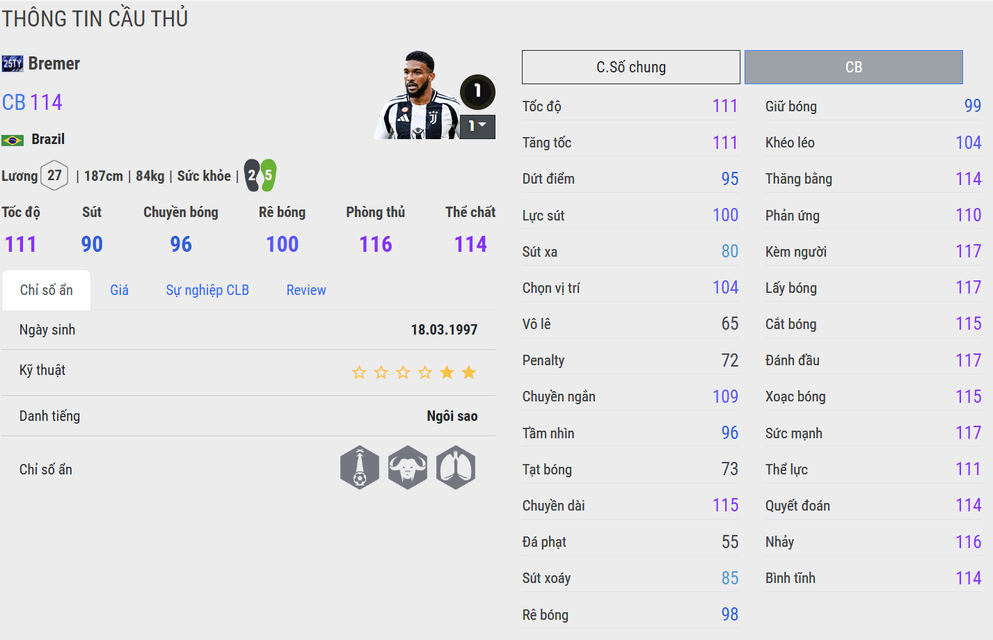Bremer sở hữu tốc độ khá linh hoạt, không phải mẫu trung vệ quá nhanh, nhưng đủ để đảm bảo hiệu quả trong những pha di chuyển, đua tốc hay áp sát tiền đạo đối phương.