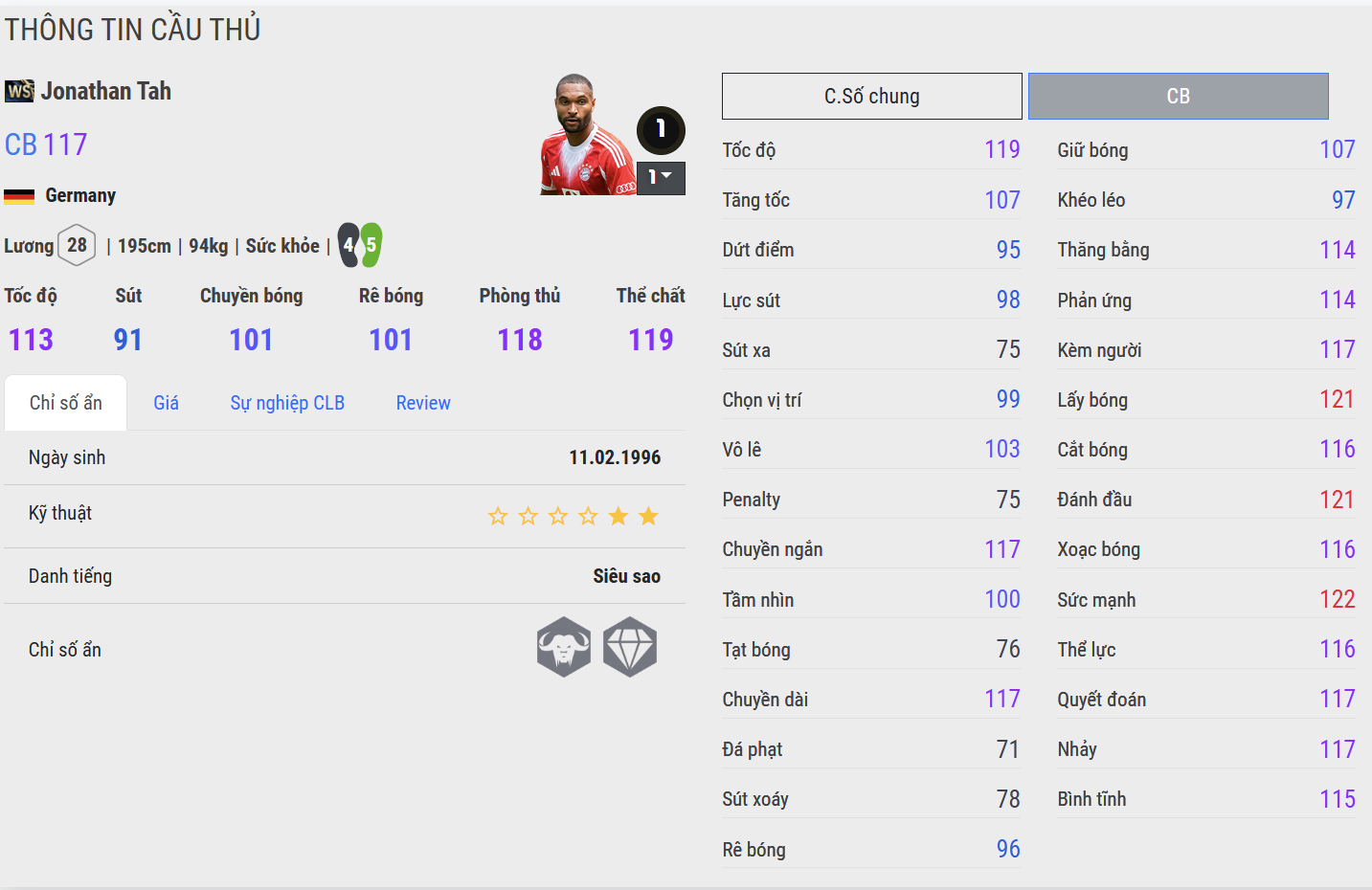 Không quá lời khi nói Tah WS là một trong những trung vệ tì đè tốt nhất trong game ở thời điểm hiện tại. Thể hình to bản, trọng tâm thấp và cơ bắp dày giúp anh gần như bất khả chiến bại trong những pha tay đôi. Một cú đẩy vai của Tah đủ khiến hầu hết tiền đạo ngã ra xa. Dù vậy, anh không tì đè một cách thô bạo, mà dùng sức đúng lúc, đúng chỗ – khiến đối phương vừa mất bóng vừa bị bóp nghẹt không gian xử lý. Khi cần, anh sẵn sàng “chặn người, cướp bóng” một cách gọn gàng và hiệu quả đến lạnh lùng.