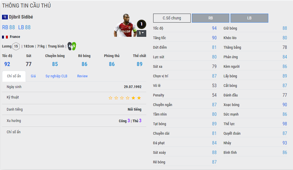 Hậu vệ người Pháp có chiều cao cùng với thể hình rất đẹp với meta hiện nay, so với các cái hot hiện nay thì Sidibe không có ma tốc độ. Nhưng bù lại khả năng phòng ngự của hậu vệ này được đảm bảo khá tốt. Một điểm cộng nữa là để sở hữu thẻ +8 của cầu thủ này không quá đắt.