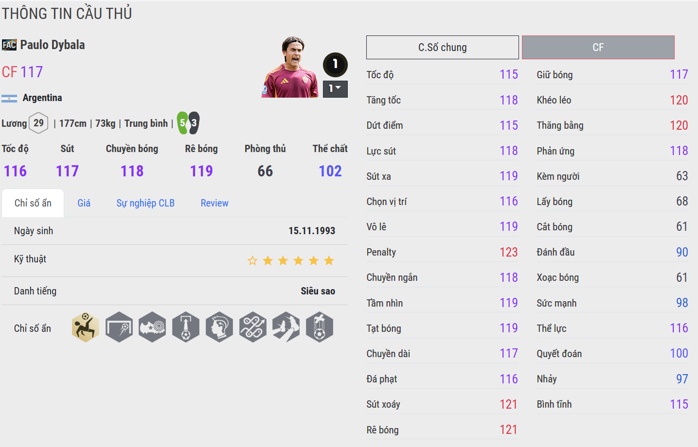 Tốc độ của Dybala FAC không thuộc nhóm bứt phá gắt, nhưng rất phù hợp với phong cách xử lý của anh. Khả năng tăng tốc ngắn, đổi hướng nhanh và di chuyển khéo léo giúp Dybala dễ dàng thoát kèm trong khu vực giữa các tuyến. Anh mạnh ở những pha cắt vào trung lộ hoặc lùi sâu nhận bóng hơn là đua tốc độ đường dài.