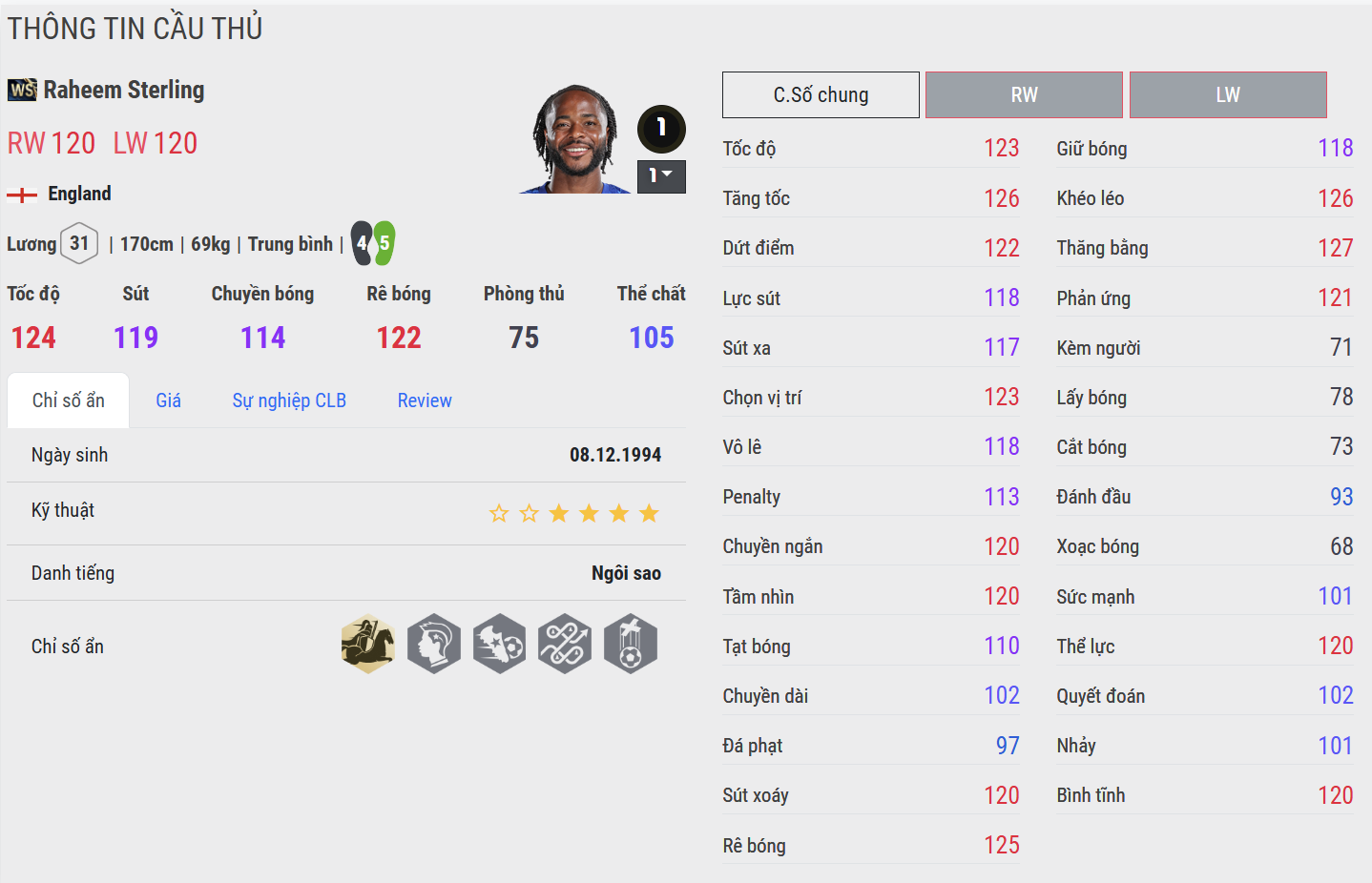 Anh sở hữu tốc độ xé gió, khả năng di chuyển không bóng thông minh và những pha cắt vào trung lộ đầy sát thương – thứ đã giúp Sterling trở thành mũi tấn công chủ lực ở cả cấp CLB lẫn đội tuyển quốc gia trong nhiều năm.
