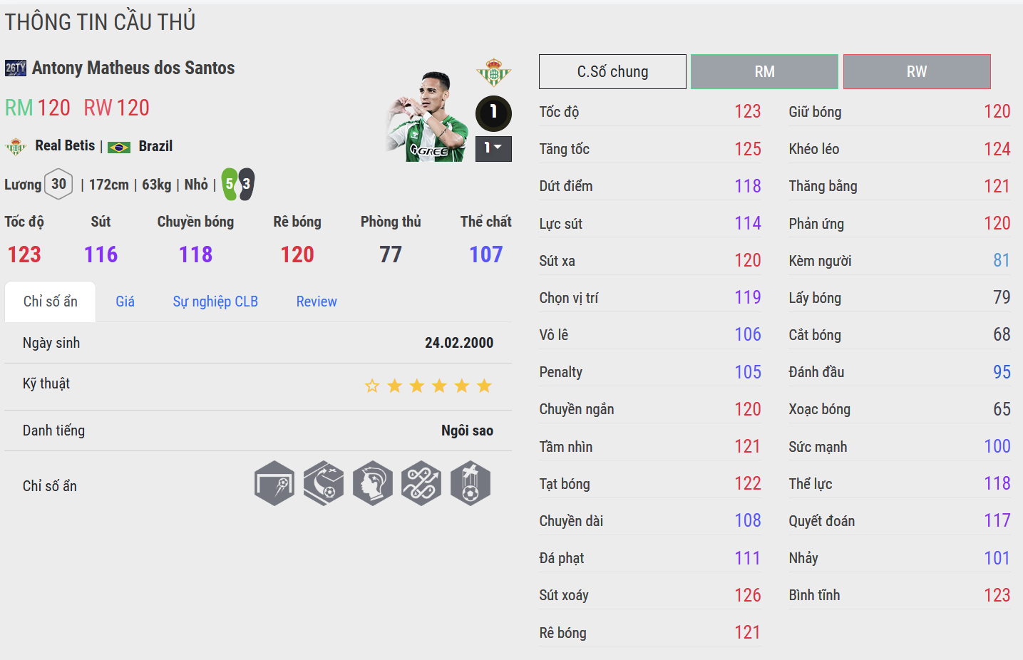 Rê bóng là điểm mạnh rõ ràng nhất của Antony 26TOTY. Cảm giác dính chân, khả năng đảo hướng và giữ bóng trong không gian hẹp rất tốt. Những pha xử lý 1v1 mang lại cảm giác kiểm soát cao, đặc biệt khi đối phương không áp sát quá rát. Đây là mẫu cầu thủ càng có bóng càng dễ tạo đột biến.