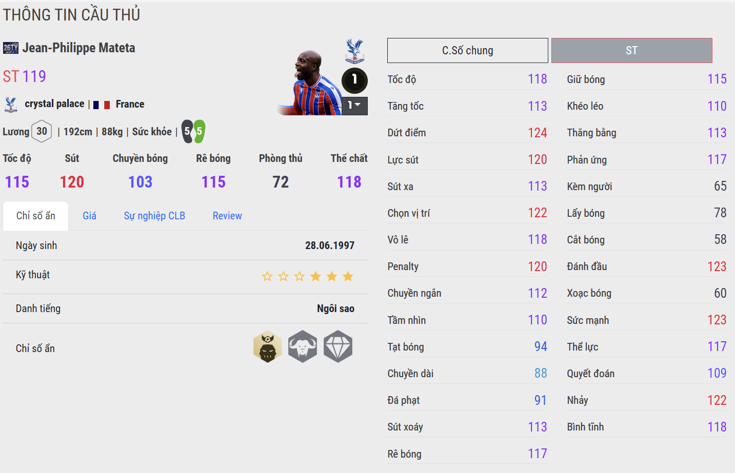 Với thể hình cao lớn, Mateta không tạo cảm giác quá thanh thoát. Nhưng ở phiên bản 26TOTY, tốc độ của anh được cải thiện đáng kể. Tăng tốc trong 2–3 nhịp đầu khá ổn, đủ để thoát khỏi sự đeo bám khi di chuyển cắt mặt trung vệ. Trong các pha phản công dài, anh không phải mẫu vượt trội hoàn toàn, nhưng cũng không quá chậm để bị bỏ lại. Điểm mạnh nằm ở bước chạy dài và sải chân rộng – khi đã chiếm lợi thế vị trí, rất khó để hậu vệ vượt lên phía trước.
