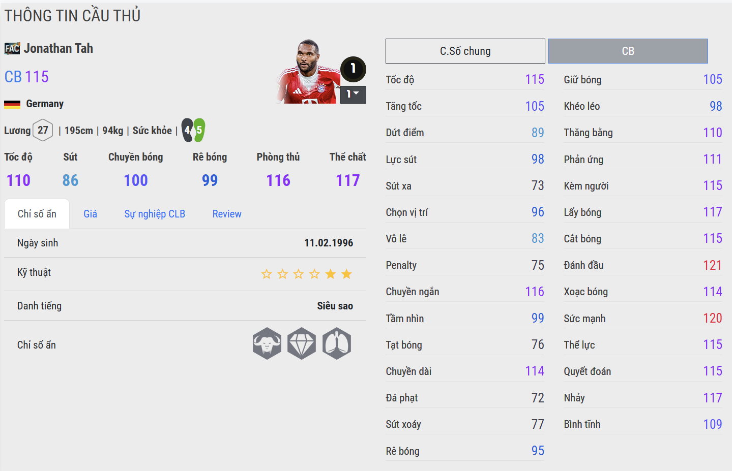 Jonathan Tah là mẫu trung vệ cổ điển mang hơi thở hiện đại – nơi thể hình, sức mạnh và sự điềm tĩnh tạo nên nền tảng phòng ngự vững chắc. Sở hữu chiều cao lý tưởng cùng khả năng tranh chấp mạnh mẽ, Tah đặc biệt nổi bật trong những pha không chiến và các tình huống đối mặt trực diện, luôn cho thấy sự chắc chắn và quyết đoán trong từng pha can thiệp.