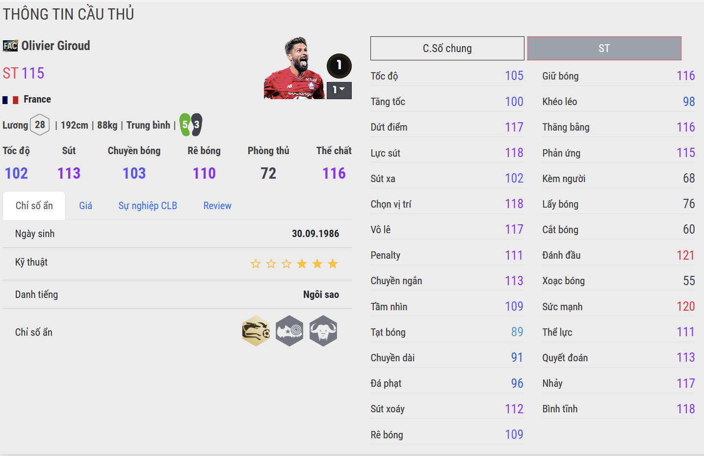Tì đè là giá trị cốt lõi của Giroud FAC. Thể hình cao lớn, sức mạnh tốt giúp anh che chắn bóng cực kỳ hiệu quả, thắng thế trong các pha tranh chấp tay đôi và làm tường rất ổn định. Đây là yếu tố giúp Giroud trở thành trung tâm trong các pha lên bóng trực diện.