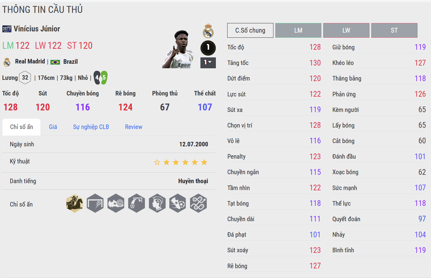 Rê bóng chính là điểm làm nên thương hiệu của Vinícius Jr. 26TOTY. Cảm giác bóng cực kỳ dính chân, đổi hướng nhanh, động tác giả hiệu quả và rất khó đoán. Anh phù hợp với những pha solo, kéo bóng và tạo đột biến cá nhân. Khi vào tay người chơi thích kỹ thuật, Vinícius mang lại cảm giác chơi bóng cực kỳ “đã”.
