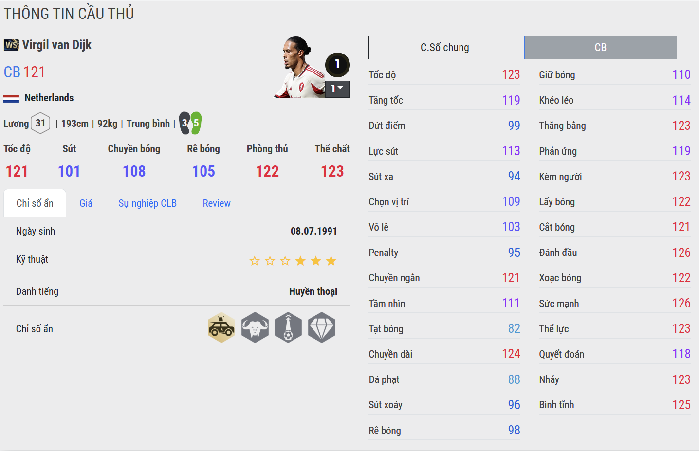 Với một trung vệ cao to như Van Dijk, tốc độ mùa WS vẫn nằm ở mức rất tốt. Anh không bứt phá quá nhanh như các CB nhỏ con, nhưng khả năng tăng tốc trong những pha đua nước rút ngắn là đủ để theo sát các tiền đạo tốc độ. Điều quan trọng hơn cả là Van Dijk biết cách chọn vị trí và di chuyển hợp lý, giúp anh hiếm khi bị đặt vào thế phải “chạy đua sinh tử”.