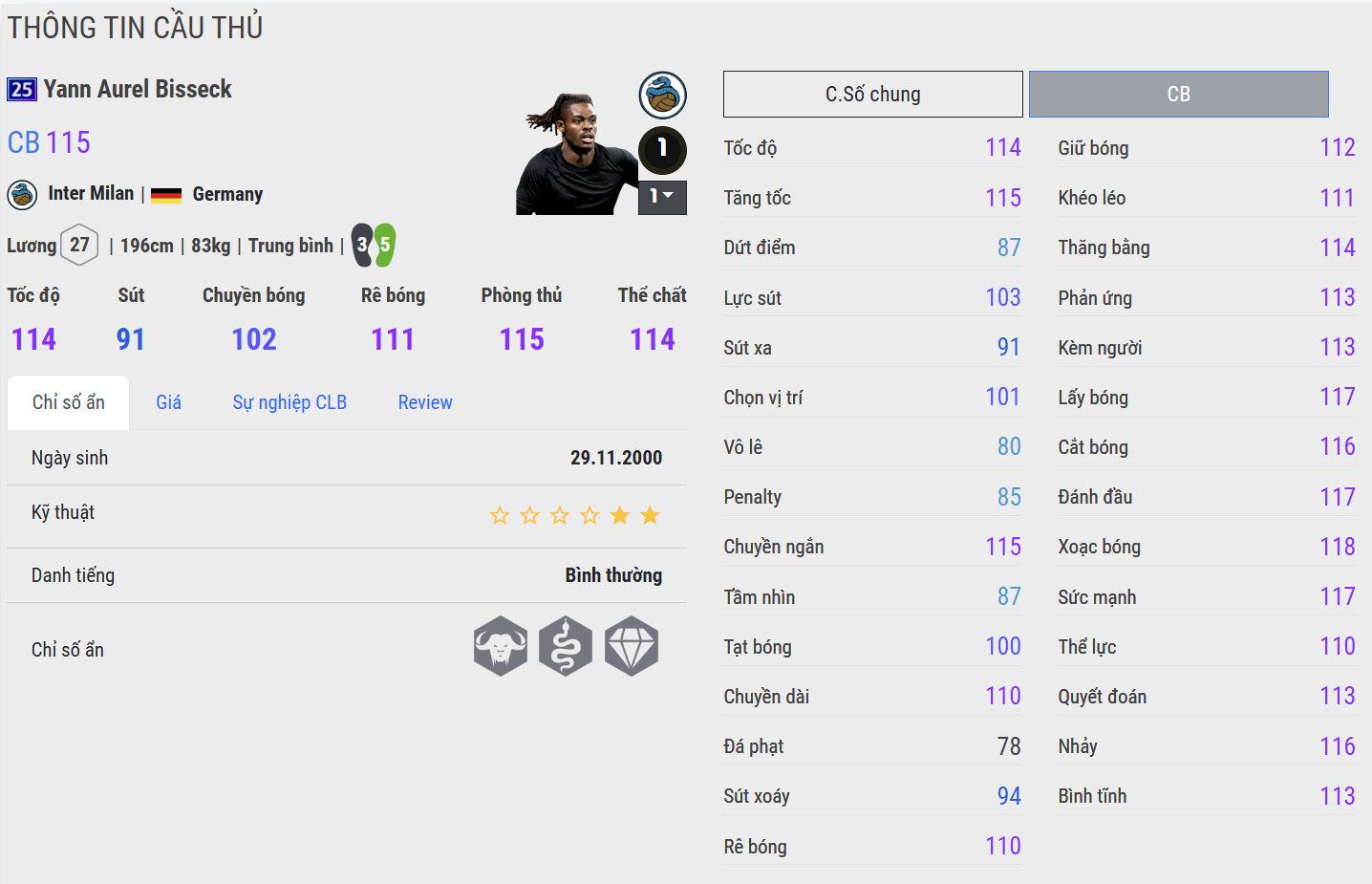 Yann Aurel Bisseck là mẫu trung vệ hiện đại mang đậm dấu ấn thể chất – nơi chiều cao, sức mạnh và khả năng tranh chấp tạo nên một chốt chặn đầy uy lực nơi hàng thủ. Trong màu áo Inter Milan, anh là phương án giàu tiềm năng, mang đến sự chắc chắn và năng lượng cho tuyến dưới.