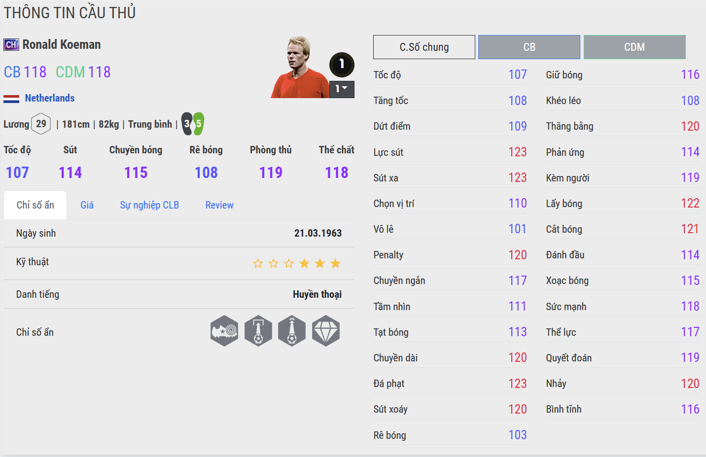 Koeman mùa CH sở hữu tốc độ ở mức khá, đủ để đeo bám và xử lý trong nhiều tình huống phòng ngự. Tuy nhiên, anh không phải mẫu trung vệ thiên về bứt tốc, nên khi gặp những tiền đạo quá nhanh, người chơi cần bọc lót hợp lý để phát huy tối đa khả năng của anh.