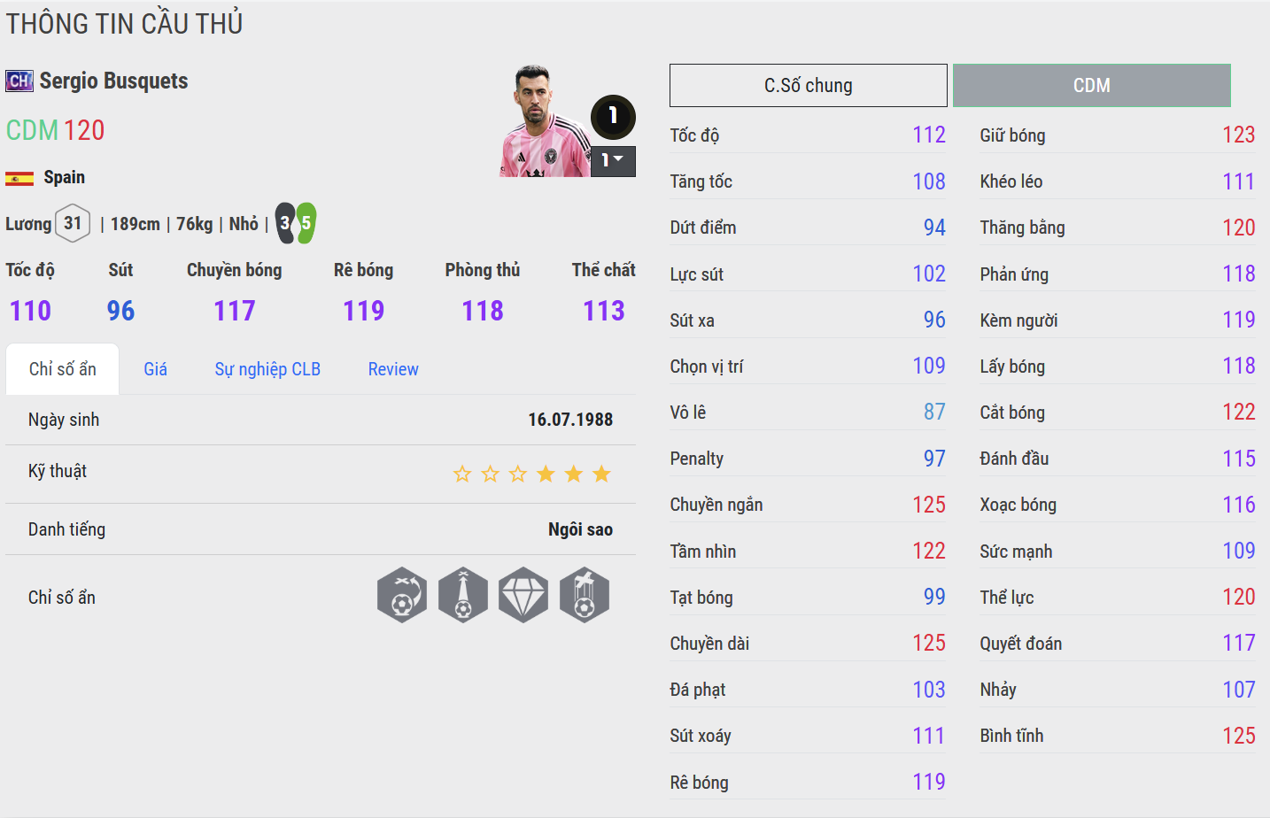 Busquets không nổi bật về tốc độ, dễ bị đối thủ tốc độ cao vượt qua nếu phải đua sải dài. Tuy nhiên, anh chọn vị trí rất khôn ngoan, giúp hạn chế nhược điểm này. Với người chơi thích kiểm soát và đọc tình huống, điểm yếu tốc độ không còn quá đáng lo.