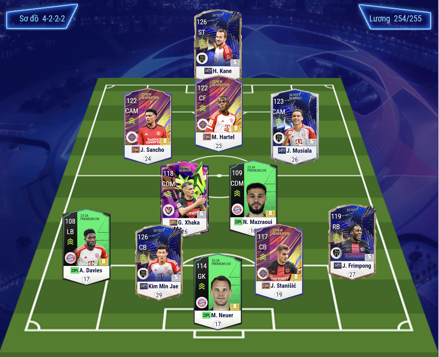 Sơ đồ 4222 ST/CF được sử dụng với vị trí tiền đạo cắm là Kane. Hộ công cho anh là cầu thủ trẻ Tel. Bộ đôi tiền vệ công lệch trái phải LAM/RAM được lựa chọn là Sancho và Musiala. Cả 2 đều có tốc độ tốt và khả năng rê dắt cực kì dẻo.