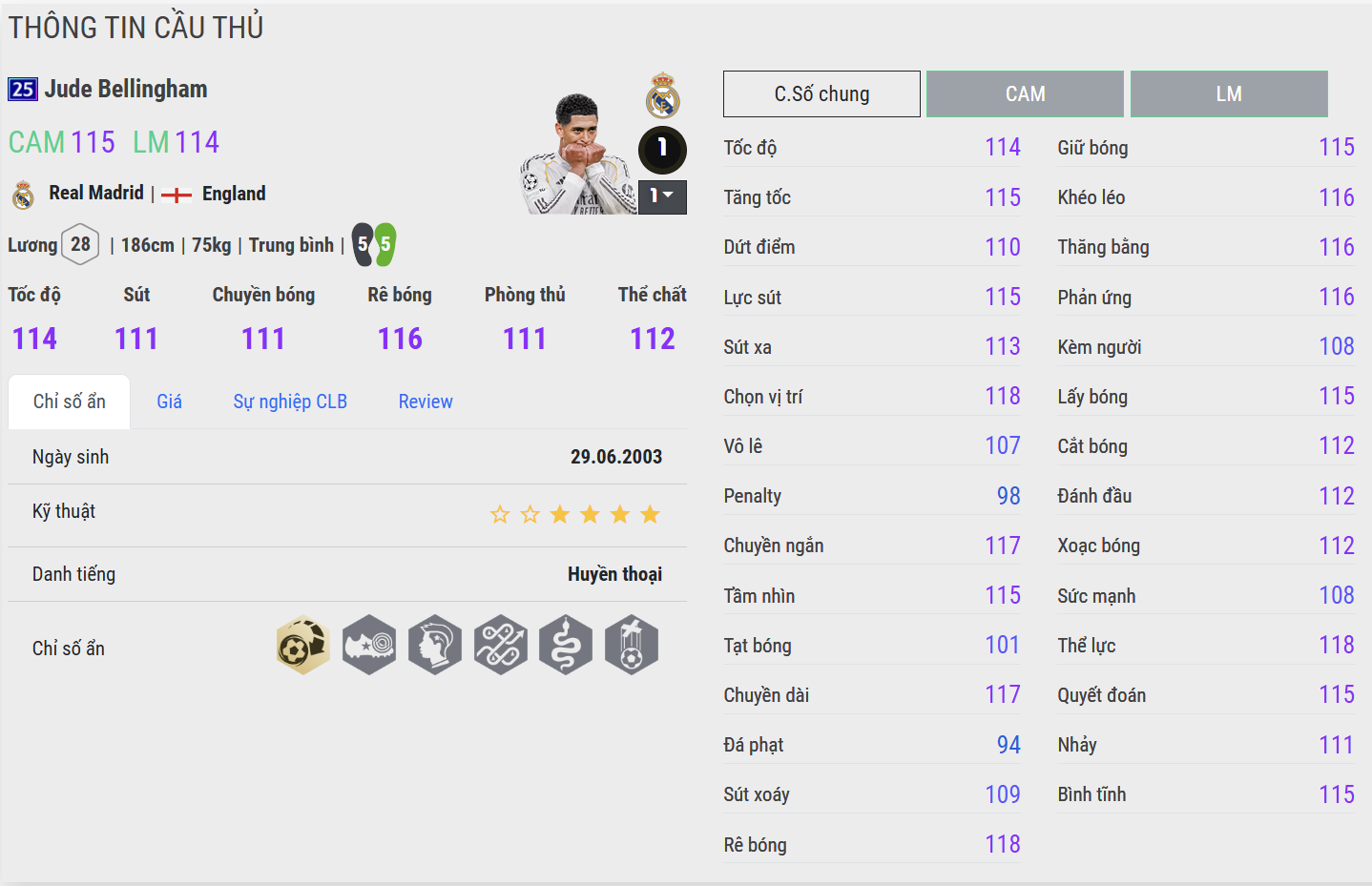 Bellingham 25UCL mang phong cách box-to-box thiên công. Khả năng xâm nhập vòng cấm và tranh chấp tốt giúp anh tạo ảnh hưởng rộng, nhưng về độ mượt trong xử lý và tính đột biến thuần kỹ thuật vẫn chưa nổi bật bằng các cái tên phía trên. Phù hợp đá CM/CAM trong sơ đồ cần sức mạnh và cường độ.