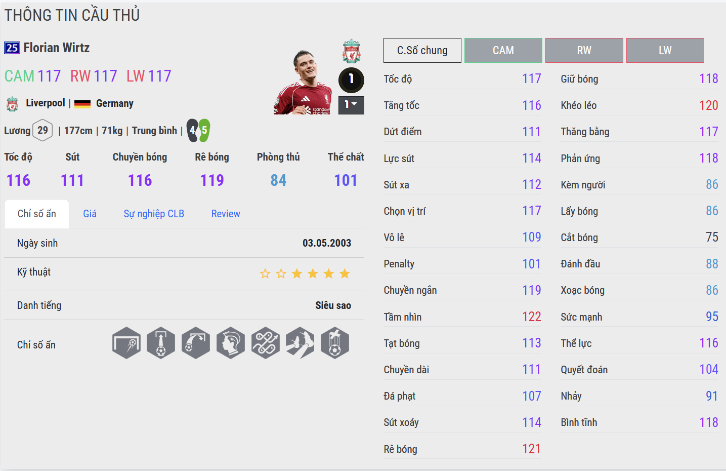 Wirtz 25UCL là mẫu CAM kỹ thuật, mềm mại và giàu tính sáng tạo. Khả năng xoay trở trong không gian hẹp rất ổn, chuyền ngắn mượt và giữ nhịp tốt. Tuy nhiên ở khâu tranh chấp và dứt điểm áp lực cao, Wirtz thiên về hỗ trợ hơn là trực tiếp gánh team.