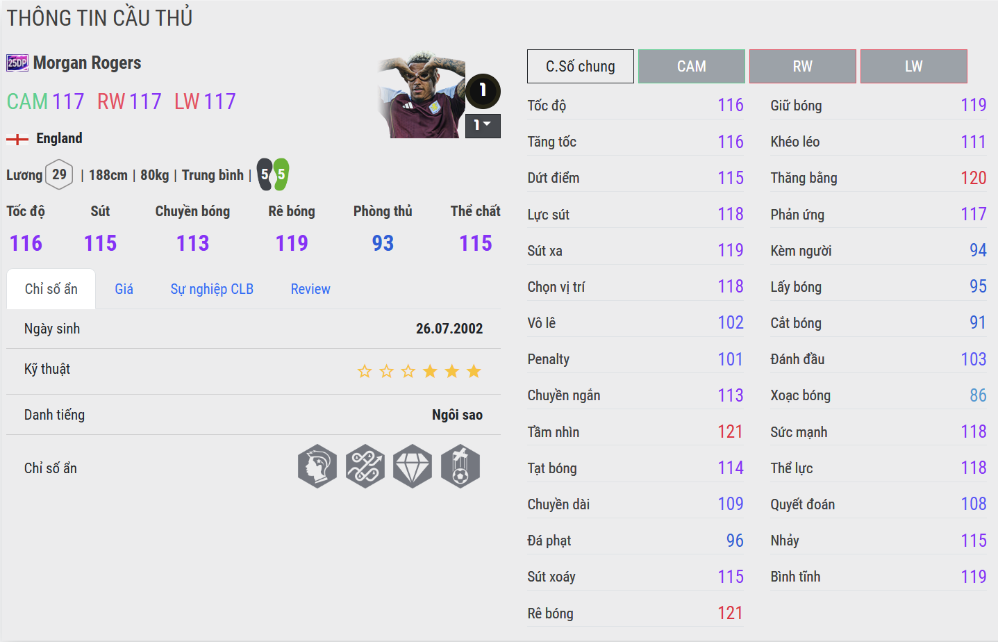 Rogers 25DP là hình ảnh tiêu biểu cho một CAM trẻ trung, năng lượng dồi dào và đầy bản năng. Anh sở hữu tốc độ bứt phá nhanh nhẹn, khả năng rê bóng linh hoạt cùng những pha xử lý táo bạo trong không gian hẹp. Trong gameplay, Rogers tạo cảm giác tươi mới và khó lường – luôn sẵn sàng xâm nhập vòng cấm hoặc tung ra đường chuyền mở toang hàng thủ. Dù chưa chín chắn như các đàn anh, anh vẫn là lựa chọn đầy tiềm năng cho những HLV ưa lối chơi trực diện, nhanh và biến hóa.