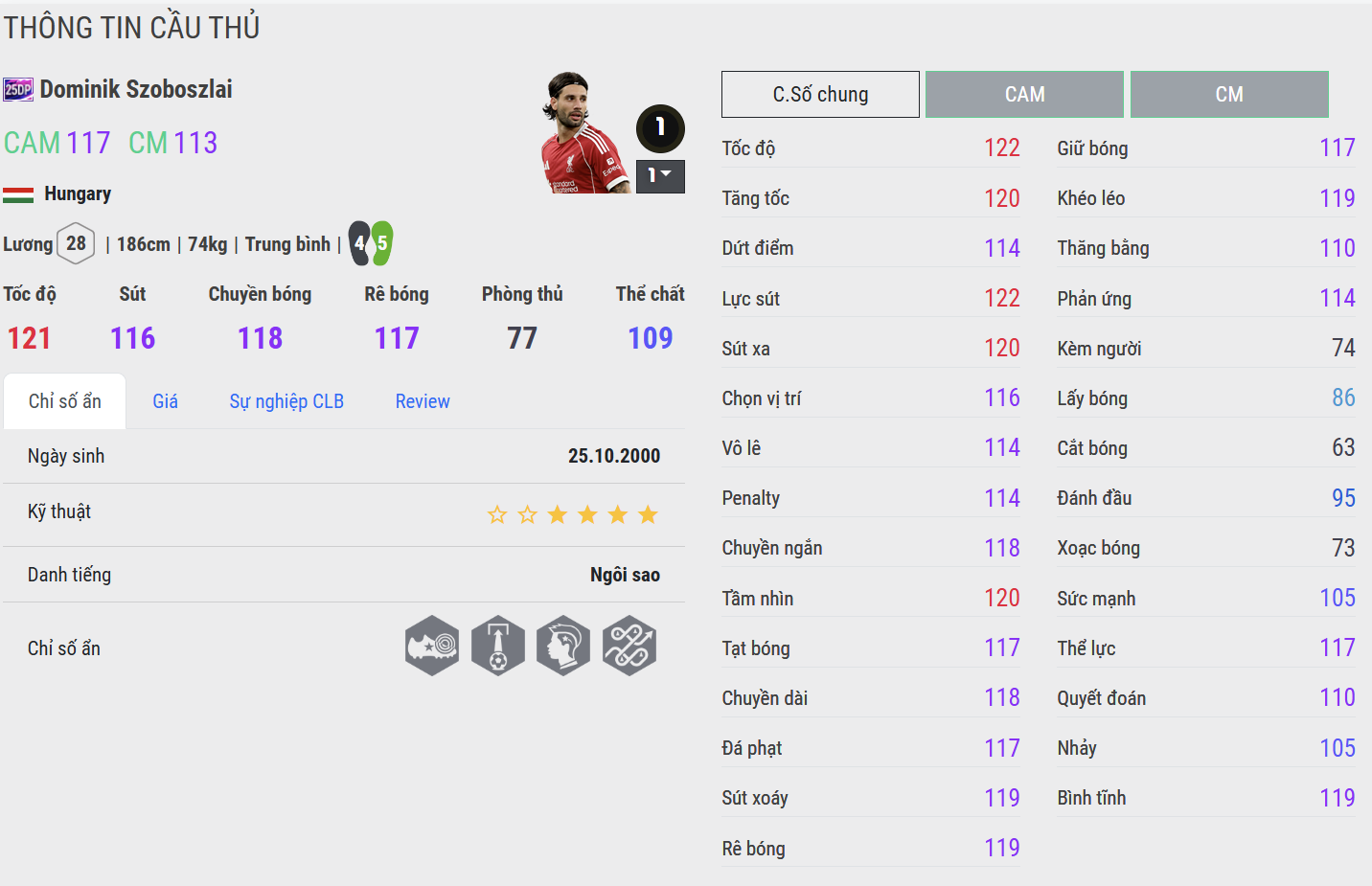 Szoboszlai 25DP là hình mẫu tiền vệ công toàn diện. Anh kết hợp nhãn quan chiến thuật sắc bén, khả năng chuyền bóng chính xác và những cú sút xa thương hiệu. Trong gameplay, Szoboszlai luôn chủ động – biết khi nào giữ nhịp, khi nào tạo đột phá. Anh vừa là “bộ não” sáng tạo, vừa là mũi tấn công hiệu quả, mang đến sự cân bằng hiếm có cho mọi đội hình thiên về kiểm soát và tấn công phối hợp.