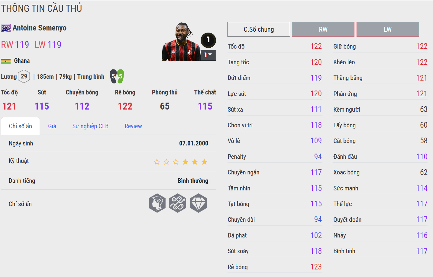 Semenyo 25DP là hiện thân của năng lượng và khát khao. Anh mạnh mẽ, lì lợm và bùng nổ trong từng pha phản công. Với tốc độ tốt cùng khả năng tì đè áp đảo, Semenyo không ngại va chạm, luôn lao vào tranh chấp với quyết tâm cao nhất. Trong gameplay, anh mang đến cảm giác “nhiệt” – một mũi công đầy sức sống, luôn khiến hàng thủ đối phương phải dè chừng.