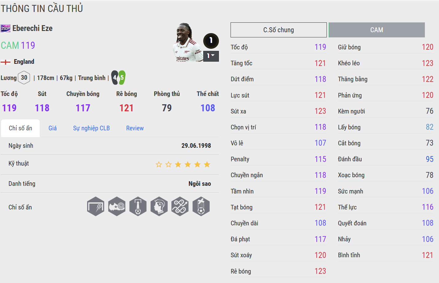Eze 25DP là linh hồn nghệ thuật của mùa thẻ này. Anh chơi bóng bằng cảm xúc, bằng sự ngẫu hứng và cái chất “dịu mà thấm” chỉ những cầu thủ thực sự tinh tế mới có. Eze rê bóng nhẹ nhàng như lướt, xử lý khéo léo trong không gian hẹp và tung ra những cú sút bất ngờ khiến đối thủ không kịp phản ứng. Trong gameplay, anh mang lại cảm giác mềm mại mà hiệu quả – một CAM mang trong mình tinh thần của Devoted Players: trung thành, bền bỉ và đầy mê hoặc.